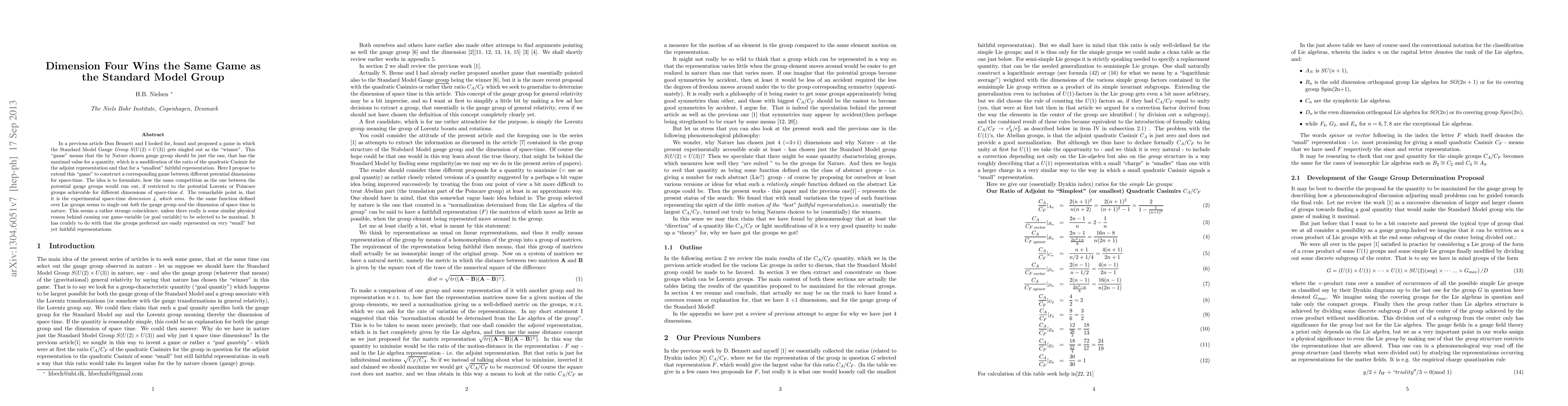 In a previous article Don Bennett and I looked for,found and proposed a game in which the Standard Model group S(U(2)XU(3)) gets singled out as the "winner". Here I propose to extend this "game" to construct a corresponding game between different potential dimensions for space time. The idea is to formulate how the same competition as the one between the potential gauge groups would run out, if restricted to the potential Lorentz or Poincare groups achievable for different dimensions of space time d. The remarkable point is that it is the experimental dimension of space time 4 which wins. So the same function defined over Lie groups seems to single out both the gauge group and the space time dimension in nature. This seems a rather strange coincidence unless there is really some similar physics behind.