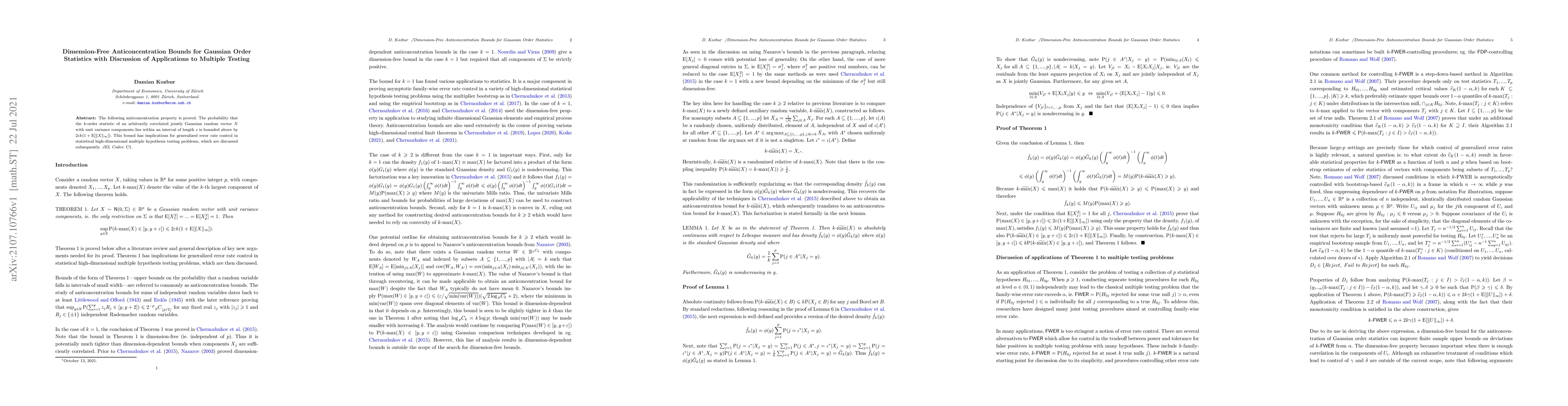 This paper proves a dimension-free anticoncentration bound for Gaussian order statistics, which helps control error rates in high-dimensional multiple hypothesis testing problems. The bound is $2{ ilde{ ext{e}}} ilde{k} (1+ ext{E}[ ilde{x}_{ ext{max}}])$ where $ ilde{k}$ and $ ilde{x}_{ ext{max}}$ are the order statistic and maximum value of a Gaussian random vector, respectively.