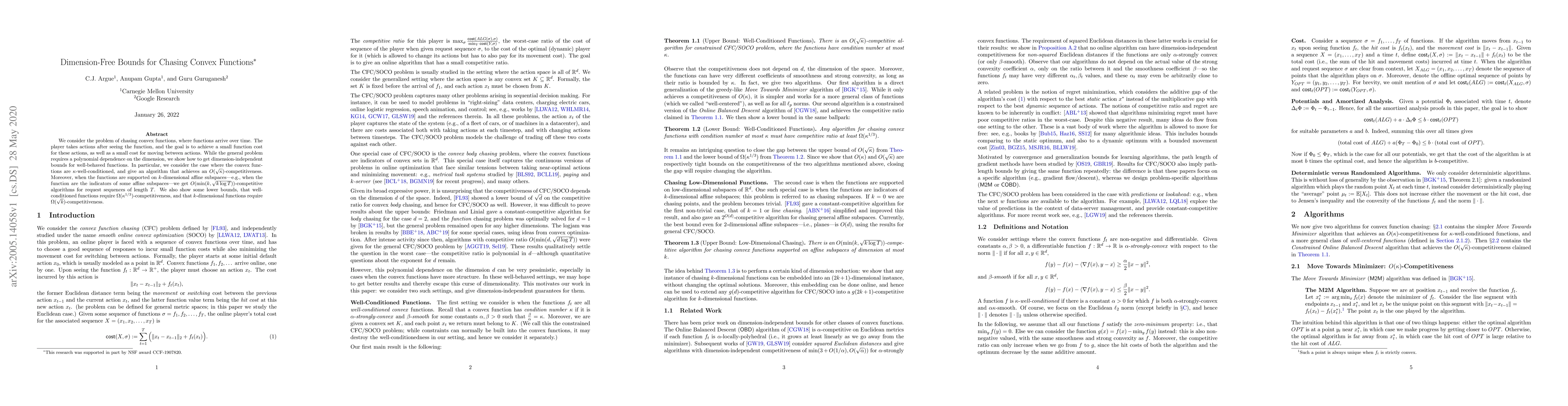 This paper presents dimension-independent bounds for chasing convex functions, achieving $O(\sqrt \kappa)$-competitiveness for $\kappa$-well-conditioned functions and $O(\min(k, \sqrt{k \log T}))$-competitiveness for functions on $k$-dimensional subspaces. It also establishes lower bounds showing inherent competitive requirements.