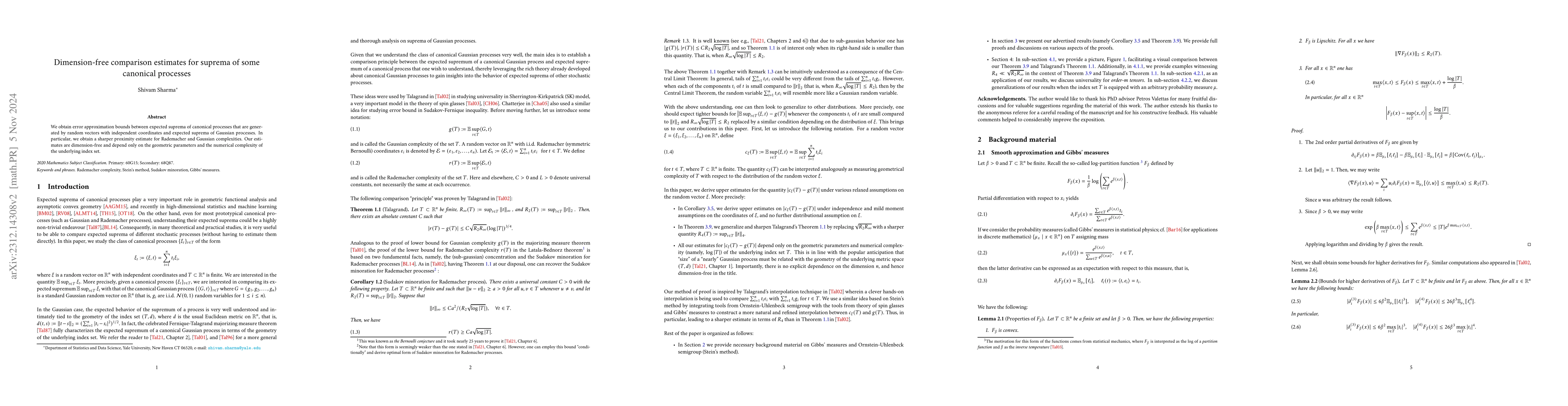 Summary: This paper provides dimension-free error approximation bounds for the expected suprema of canonical processes versus Gaussian processes, offering sharper estimates for Rademacher and Gaussian complexities based on geometric and numerical parameters of the index set.