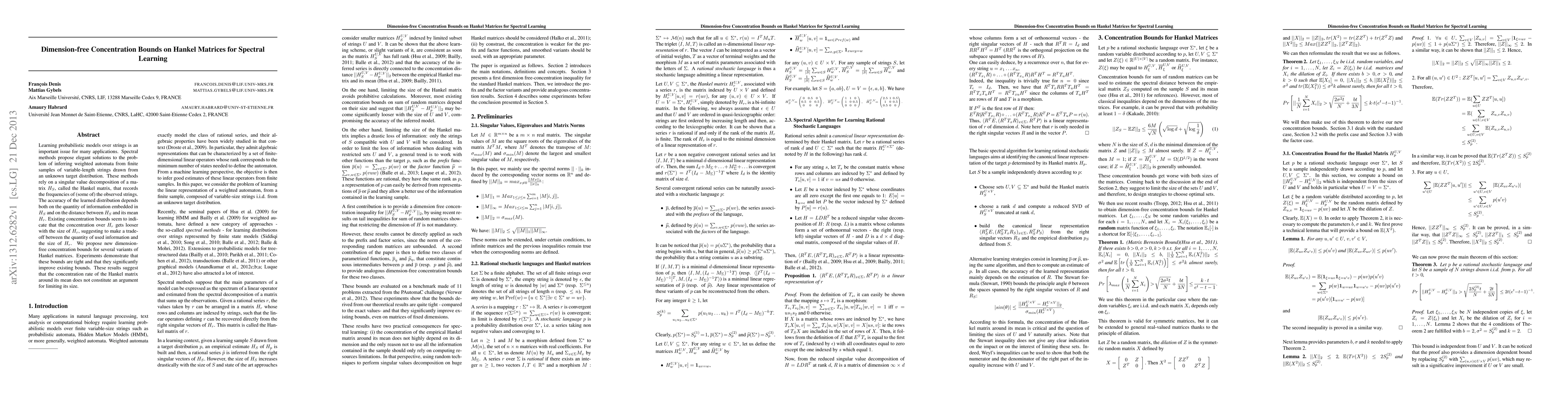 This paper proposes new dimension-free concentration bounds for Hankel matrices used in spectral learning of probabilistic models over strings. These improved bounds show that the concentration rate around the mean does not necessitate a trade-off between information quantity and matrix size, enhancing the accuracy of inferred distributions.