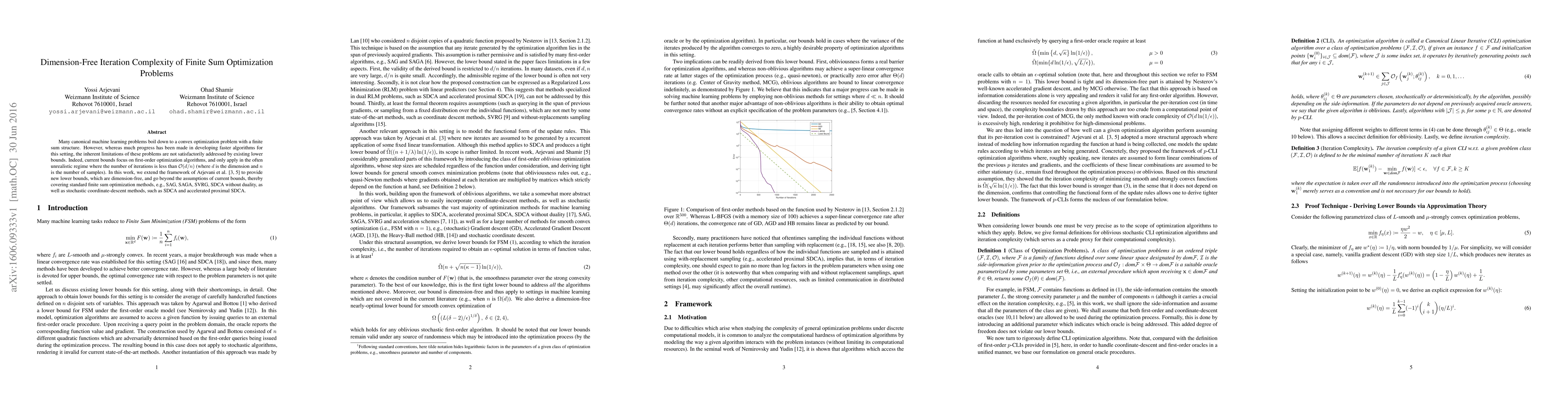 Many canonical machine learning problems boil down to a convex optimization problem with a finite sum structure. However, whereas much progress has been made in developing faster algorithms for this setting, the inherent limitations of these problems are not satisfactorily addressed by existing lower bounds. Indeed, current bounds focus on first-order optimization algorithms, and only apply in the often unrealistic regime where the number of iterations is less than $\mathcal{O}(d/n)$ (where $d$ is the dimension and $n$ is the number of samples). In this work, we extend the framework of (Arjevani et al., 2015) to provide new lower bounds, which are dimension-free, and go beyond the assumptions of current bounds, thereby covering standard finite sum optimization methods, e.g., SAG, SAGA, SVRG, SDCA without duality, as well as stochastic coordinate-descent methods, such as SDCA and accelerated proximal SDCA.
