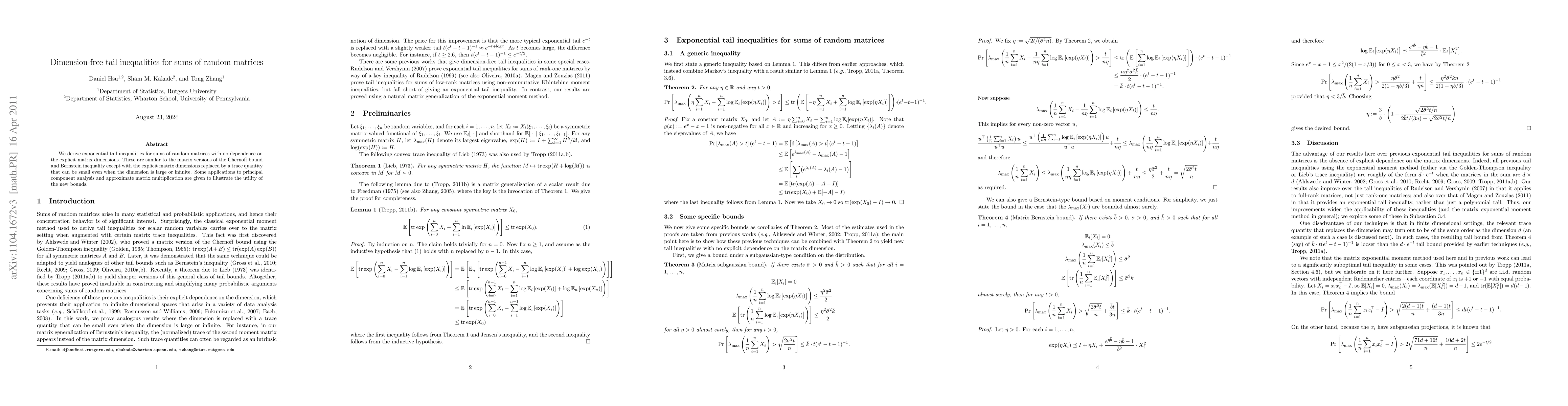 This paper presents dimension-free exponential tail inequalities for sums of random matrices, replacing explicit dimensions with a trace quantity, and demonstrates their utility in principal component analysis and approximate matrix multiplication.