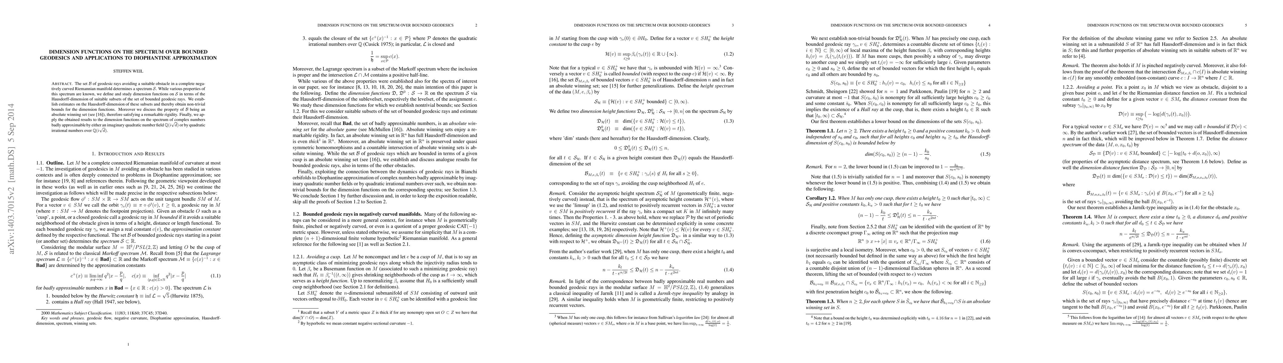 The set B of geodesic rays avoiding a suitable obstacle in a complete negatively curved Riemannian manifold determines a spectrum S. While various properties of this spectrum are known, we define and study dimension functions on S in terms of the Hausdorff-dimension of suitable subsets of the set of bounded geodesic rays. We establish estimates on the Hausdorff-dimension of these subsets and thereby obtain non-trivial bounds for the dimension functions. Moreover we discuss the property of B being an absolute winning set, therefore satisfying a remarkable rigidity. Finally, we apply the obtained results to the dimension functions on the spectrum of complex numbers badly approximable by either an imaginary quadratic number field $Q(i \sqrt{d})$ or by quadratic irrational numbers over $Q(i \sqrt{d})$.