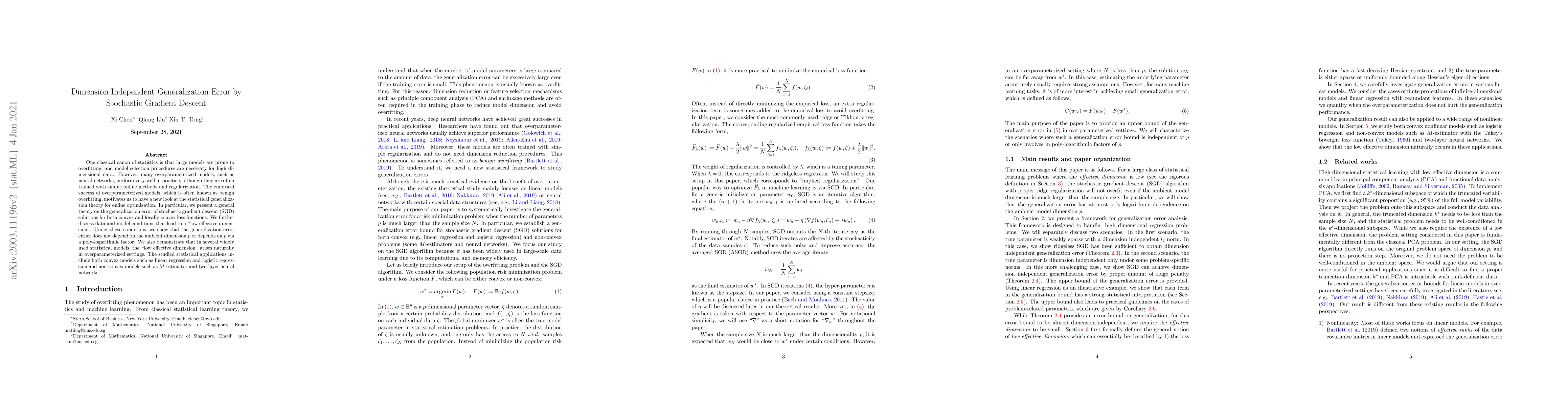 One classical canon of statistics is that large models are prone to overfitting, and model selection procedures are necessary for high dimensional data. However, many overparameterized models, such as neural networks, perform very well in practice, although they are often trained with simple online methods and regularization. The empirical success of overparameterized models, which is often known as benign overfitting, motivates us to have a new look at the statistical generalization theory for online optimization. In particular, we present a general theory on the generalization error of stochastic gradient descent (SGD) solutions for both convex and locally convex loss functions. We further discuss data and model conditions that lead to a ``low effective dimension". Under these conditions, we show that the generalization error either does not depend on the ambient dimension $p$ or depends on $p$ via a poly-logarithmic factor. We also demonstrate that in several widely used statistical models, the ``low effective dimension'' arises naturally in overparameterized settings. The studied statistical applications include both convex models such as linear regression and logistic regression and non-convex models such as $M$-estimator and two-layer neural networks.