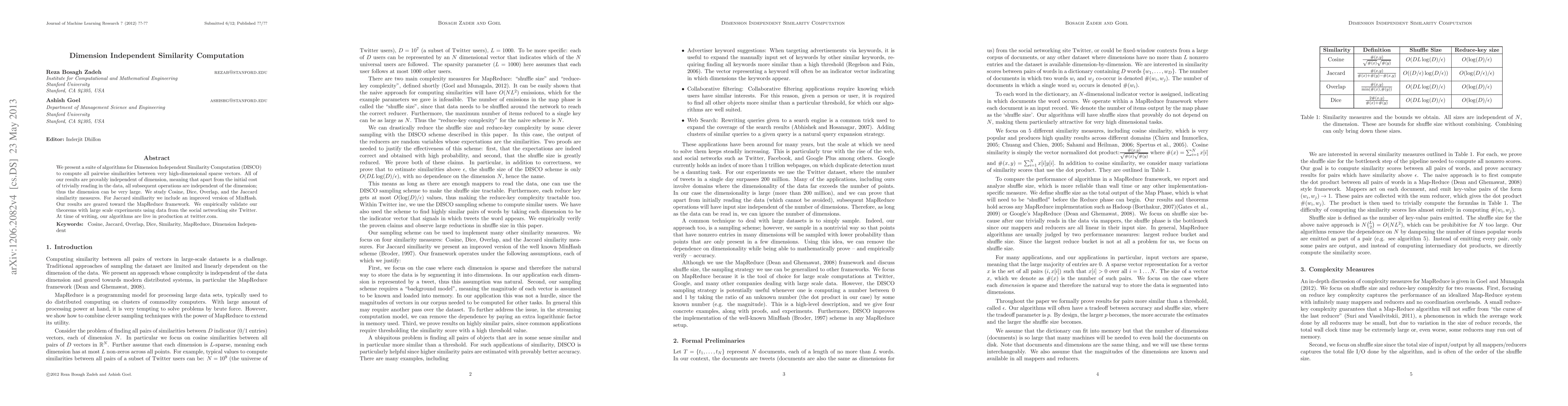 Researchers developed Dimension Independent Similarity Computation algorithms to analyze large datasets in high dimensions without losing accuracy, using the MapReduce framework. Their work has been deployed in production at Twitter and provides a foundation for scalable similarity computation.
