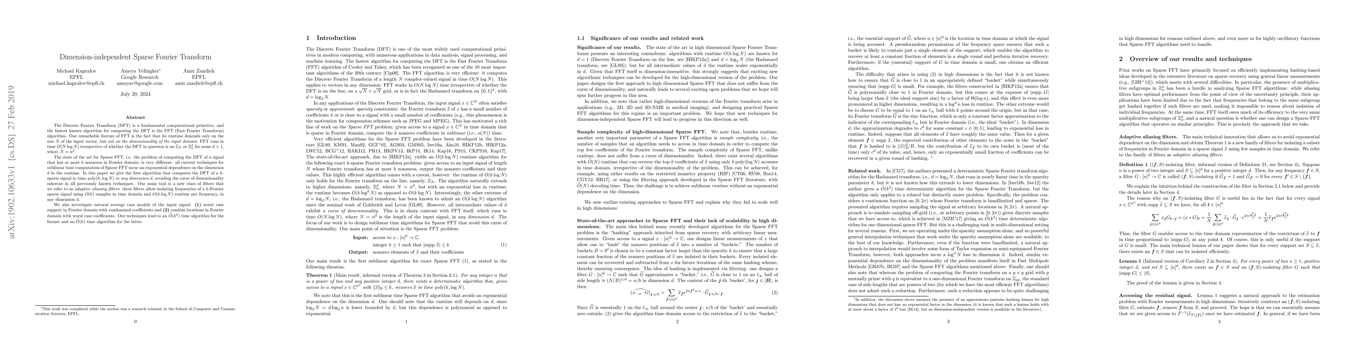 This paper presents the first dimension-independent algorithm for computing the DFT of a $k$-sparse signal, achieving $\text{poly}(k, \log N)$ runtime regardless of the input dimensionality $d$. The key innovation is adaptive aliasing filters, which isolate frequencies using $O(k)$ samples and $O(k\log N)$ runtime per frequency, overcoming the exponential dimension dependency of prior methods.