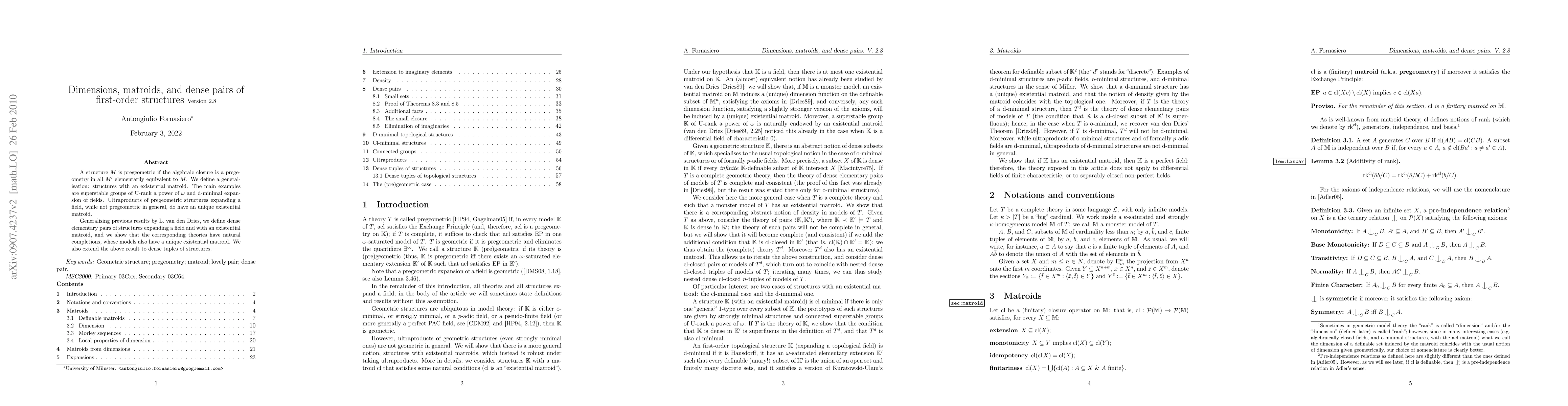 A structure M is pregeometric if the algebraic closure is a pregeometry in all M' elementarily equivalent to M. We define a generalisation: structures with an existential matroid. The main examples are superstable groups of U-rank a power of omega and d-minimal expansion of fields. Ultraproducts of pregeometric structures expanding a field, while not pregeometric in general, do have an unique existential matroid. Generalising previous results by van den Dries, we define dense elementary pairs of structures expanding a field and with an existential matroid, and we show that the corresponding theories have natural completions, whose models also have a unique existential matroid. We extend the above result to dense tuples of structures.