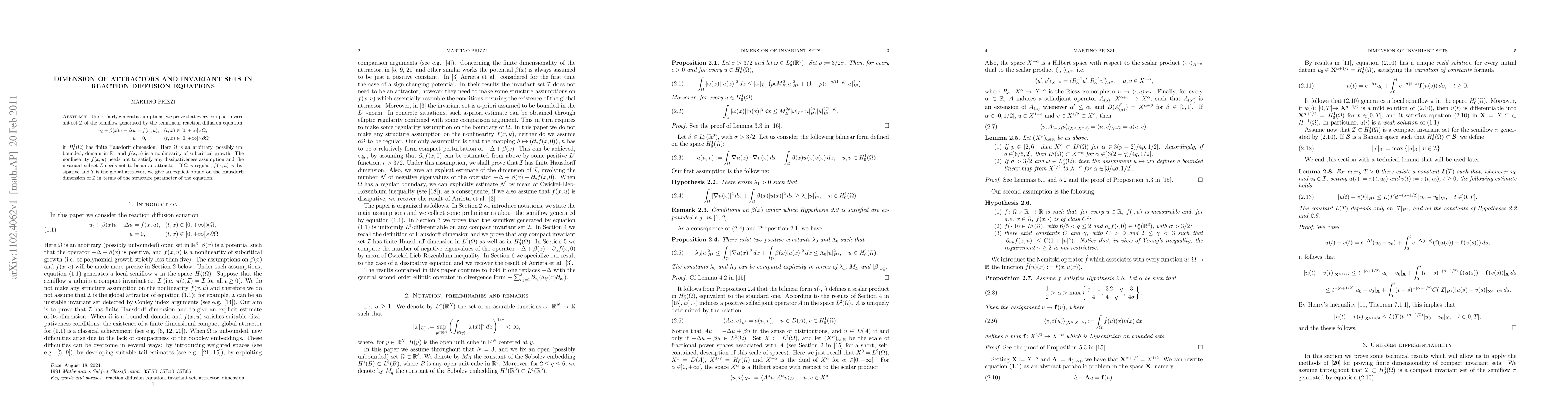 This paper proves that any compact invariant set of a semilinear reaction diffusion equation has finite Hausdorff dimension under general conditions. For regular domains, dissipative nonlinearities, and global attractors, it provides an explicit bound for the Hausdorff dimension based on the equation's structure parameter.