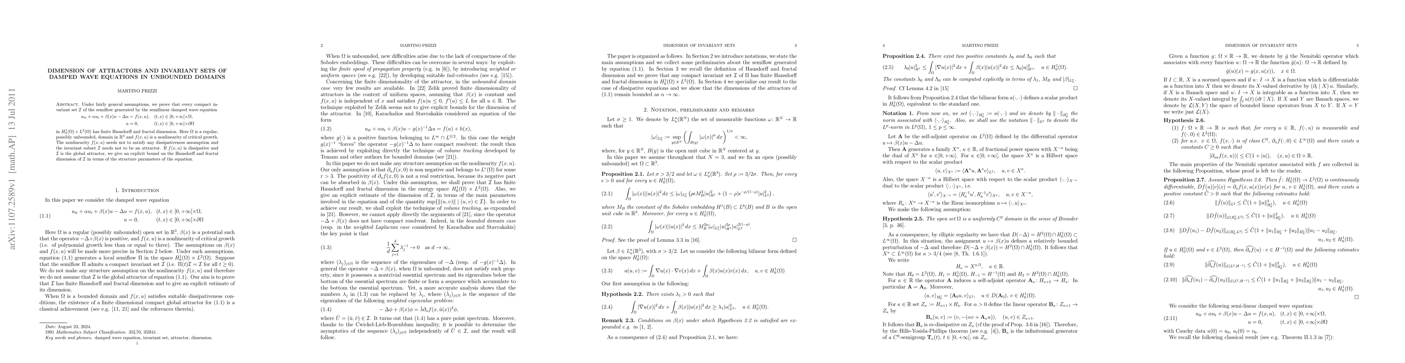 Under fairly general assumptions, we prove that every compact invariant set $\mathcal I$ of the semiflow generated by the semilinear damped wave equation u_{tt}+\alpha u_t+\beta(x)u-\Deltau = f(x,u), (t,x)\in[0,+\infty[\times\Omega, u = 0, (t,x)\in[0,+\infty[\times\partial\Omega in $H^1_0(\Omega)\times L^2(\Omega) has finite Hausdorff and fractal dimension. Here $\Omega$ is a regular, possibly unbounded, domain in $\R^3$ and $f(x,u)$ is a nonlinearity of critical growth. The nonlinearity $f(x,u)$ needs not to satisfy any dissipativeness assumption and the invariant subset $\mathcal I$ needs not to be an attractor. If $f(x,u)$ is dissipative and $\mathcal I$ is the global attractor, we give an explicit bound on the Hausdorff and fractal dimension of $\mathcal I$ in terms of the structure parameters of the equation.