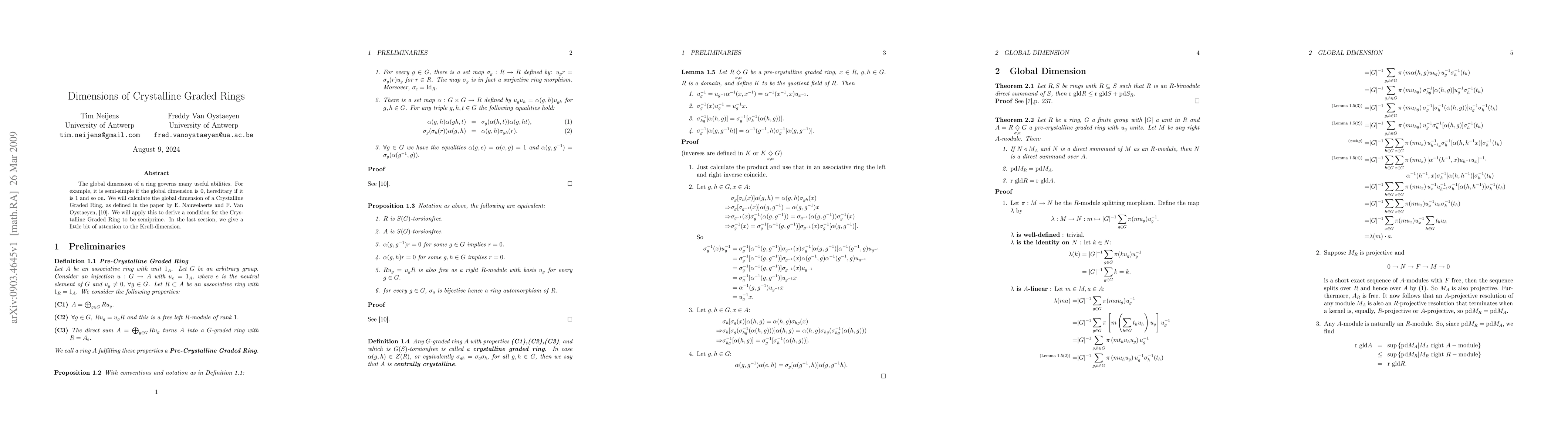 This paper calculates the global dimension of Crystalline Graded Rings, defined by Nauwelaerts and Van Oystaeyen, and derives conditions for them to be semiprime. It also briefly discusses the Krull-dimension of these rings.