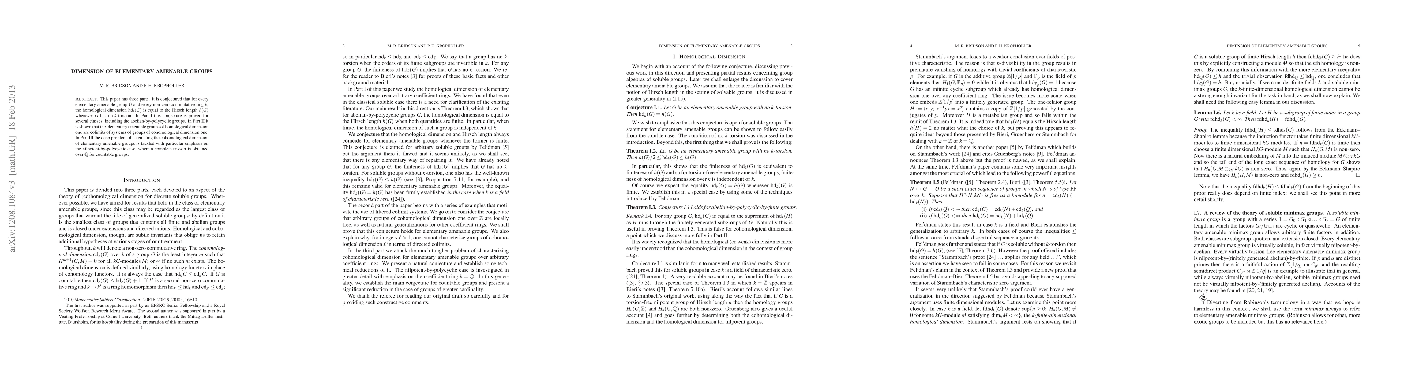 The paper has three parts. It is conjectured that for every elementary amenable group G and every non-zero commutative ring k, the homological dimension of G over k is equal to the Hirsch length of G whenever G has no k-torsion. In Part I this is proved for several classes, including the abelian-by-polycyclic groups. In Part II it is shown that elementary amenable groups of homological dimension one are filtered colimits of systems of groups of cohomological dimension one. Part III is devoted to the deeper study of cohomological dimension with particular emphasis on the nilpotent-by-polycyclic case.
