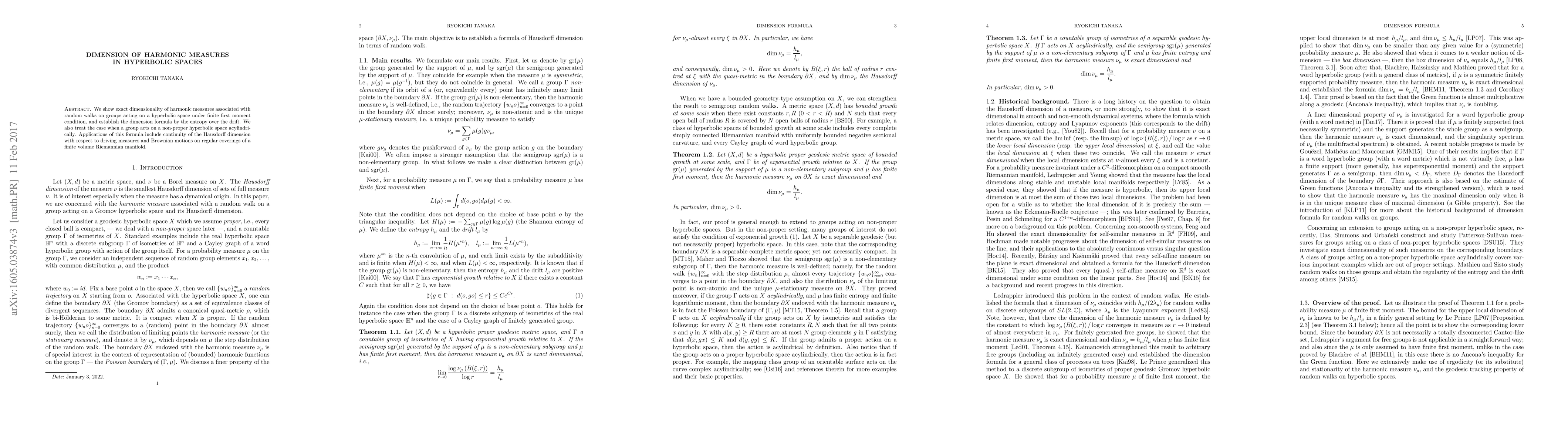 This paper determines the exact dimensionality of harmonic measures for random walks on groups acting on hyperbolic spaces, establishing a dimension formula based on entropy and drift. It also extends the analysis to non-proper hyperbolic spaces under acylindrical actions, with applications to Hausdorff dimension continuity and Brownian motions on manifold coverings.
