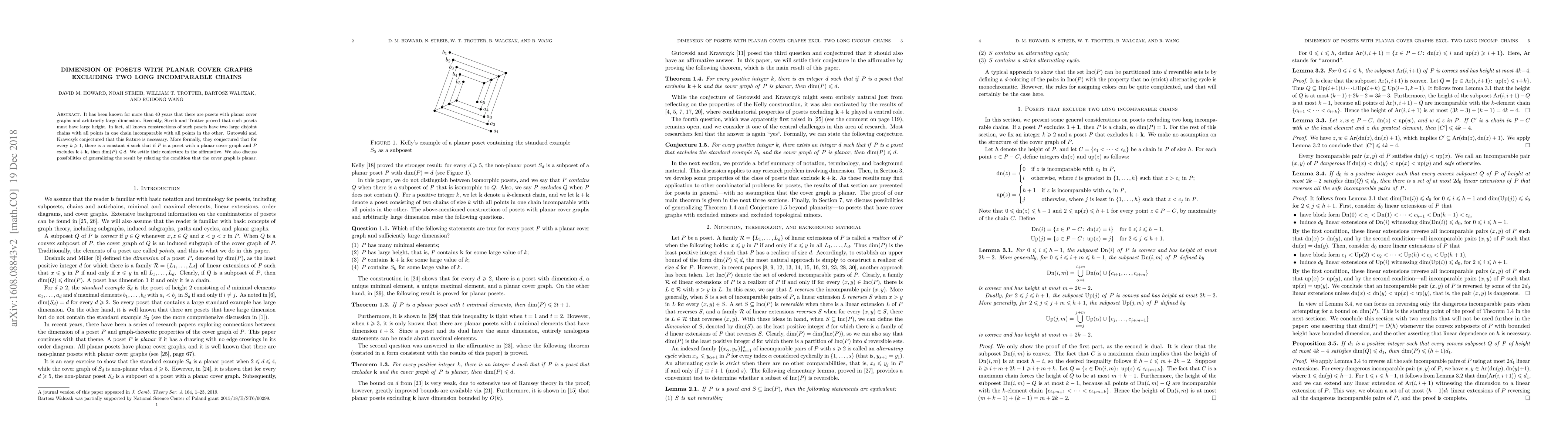Summary: This paper confirms Gutowski and Krawczyk's conjecture that posets with planar cover graphs excluding two long incomparable chains must have a bounded dimension. The authors also explore potential extensions by considering less restrictive conditions on the cover graph.