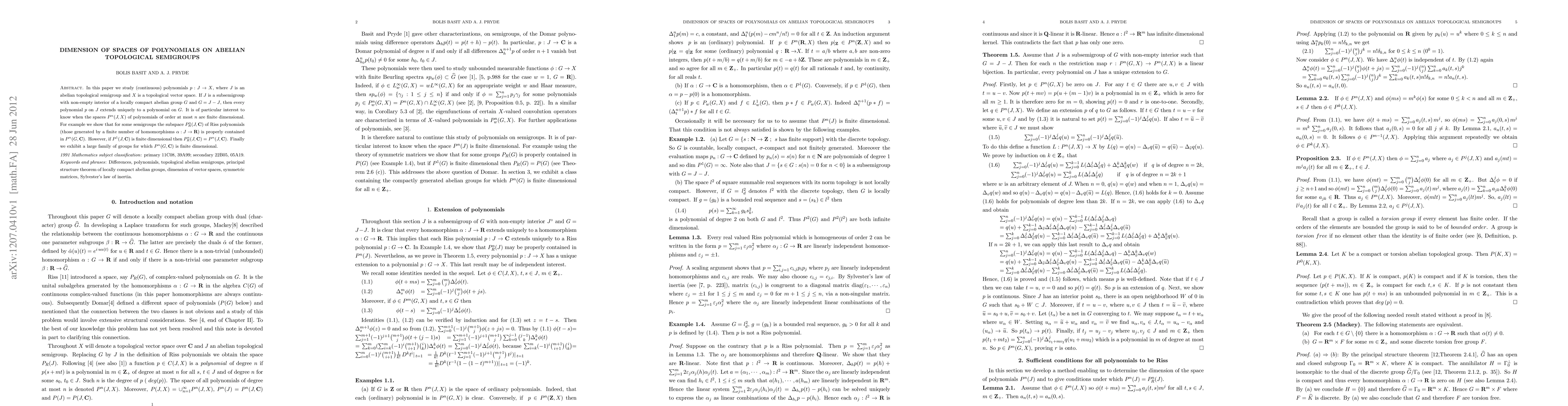 In this paper we study (continuous) polynomials $p: J\to X$, where $J$ is an abelian topological semigroup and $X$ is a topological vector space. If $J$ is a subsemigroup with non-empty interior of a locally compact abelian group $G$ and $G=J-J$, then every polynomial $p$ on $J$ extends uniquely to a polynomial on $ G$. It is of particular interest to know when the spaces $P^n (J,X)$ of polynomials of order at most $n$ are finite dimensional. For example we show that for some semigroups the subspace $P^n_{R} (J,\mathbf{C})$ of Riss polynomials (those generated by a finite number of homomorphisms $\alpha: J\to \mathbf{R}$) is properly contained in $P^n (G,\mathbf{C})$. However, if $P^1 (J,\mathbf{C})$ is finite dimensional then $P^n_{R} (J,\mathbf{C})= P^n (J,\mathbf{C})$. Finally we exhibit a large family of groups for which $P^n (G,\mathbf{C})$ is finite dimensional.