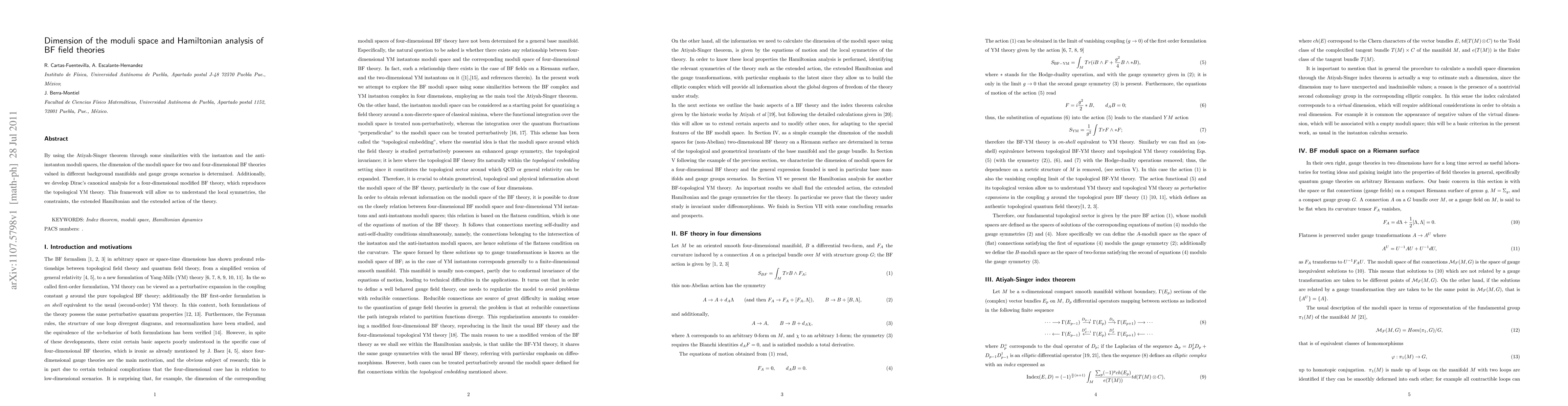 This paper determines the dimension of the moduli space for two and four-dimensional BF theories using the Atiyah-Singer theorem, and develops Dirac's canonical analysis for a modified four-dimensional BF theory, facilitating understanding of its local symmetries and Hamiltonian structure.