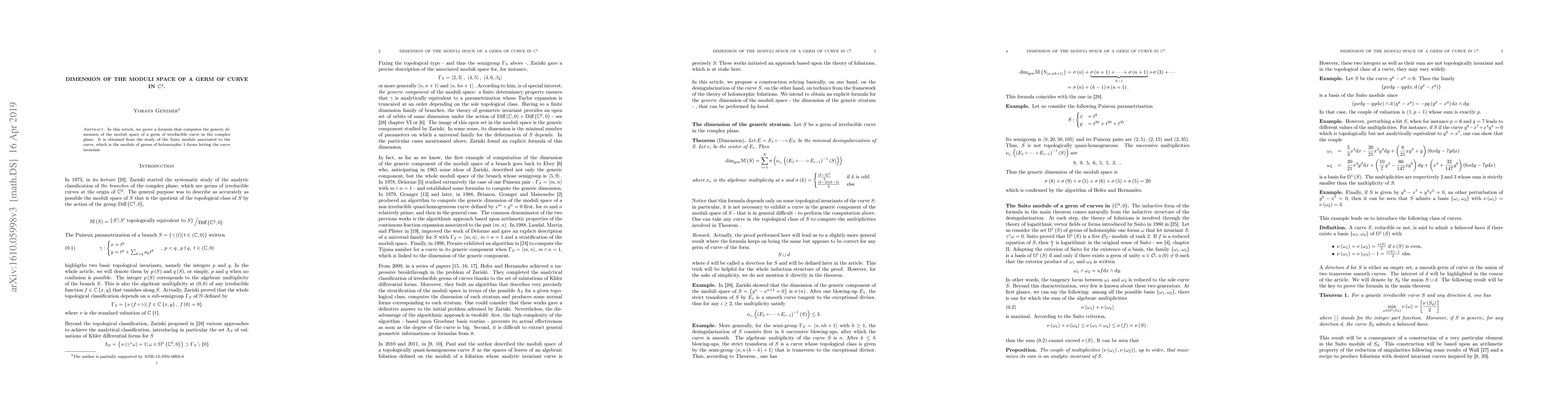 Summary: This paper provides a formula to determine the dimension of the generic component of the moduli space for an irreducible germ of curve in the complex plane. The formula aids in understanding the geometric properties of such curves.