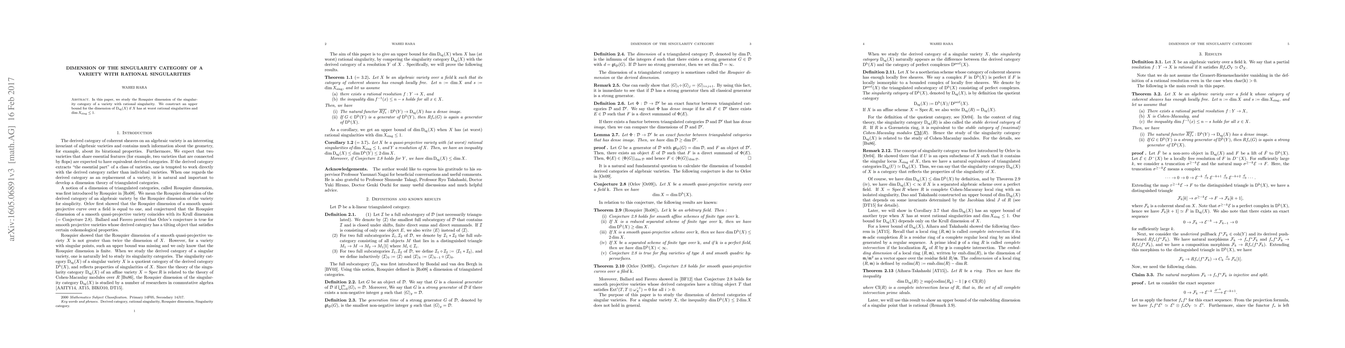 Summary: This paper investigates the Rouquier dimension of the singularity category for varieties with rational singularities, establishing an upper bound for the dimension when the singular locus has dimension at most one. The focus is on understanding the structure of the singularity category in such cases.