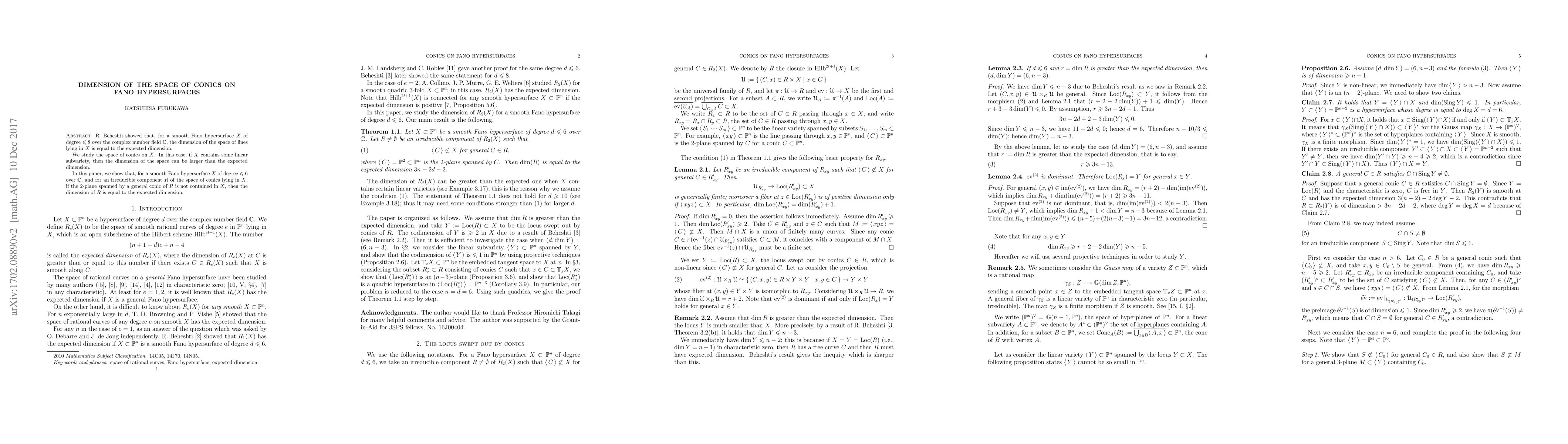 R. Beheshti showed that, for a smooth Fano hypersurface $X$ of degree $\leq 8$ over the complex number field $\mathbb{C}$, the dimension of the space of lines lying in $X$ is equal to the expected dimension. We study the space of conics on $X$. In this case, if $X$ contains some linear subvariety, then the dimension of the space can be larger than the expected dimension. In this paper, we show that, for a smooth Fano hypersurface $X$ of degree $\leq 6$ over $\mathbb{C}$, and for an irreducible component $R$ of the space of conics lying in $X$, if the $2$-plane spanned by a general conic of $R$ is not contained in $X$, then the dimension of $R$ is equal to the expected dimension.