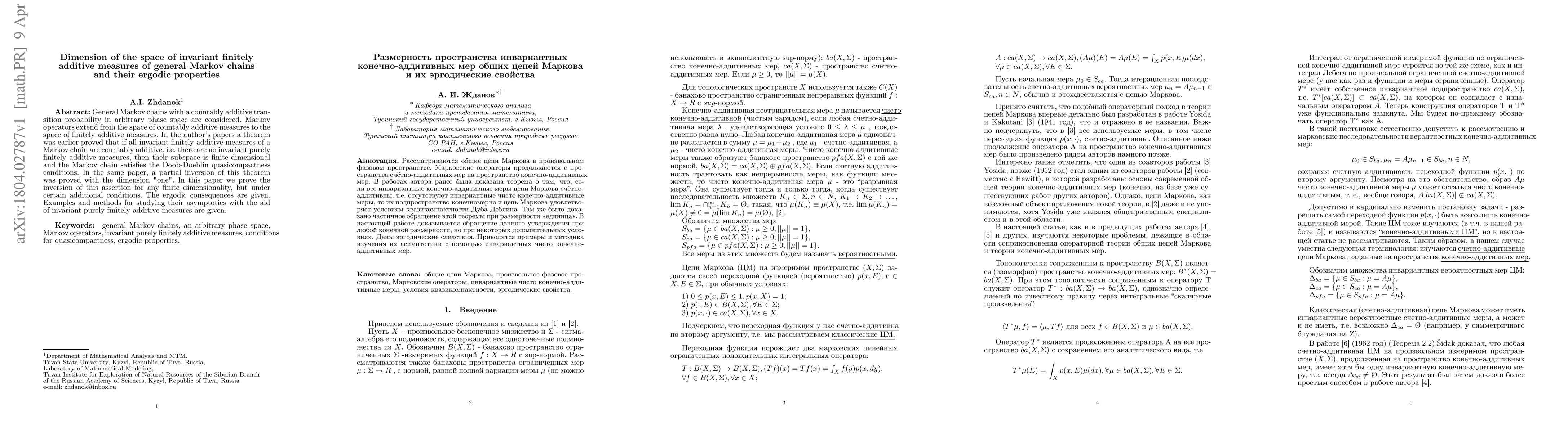 This paper investigates the dimension of the space of invariant finitely additive measures for general Markov chains and proves their finite dimensionality under additional conditions. It also explores the ergodic properties of these chains and provides methods for studying their asymptotics using invariant purely finitely additive measures.