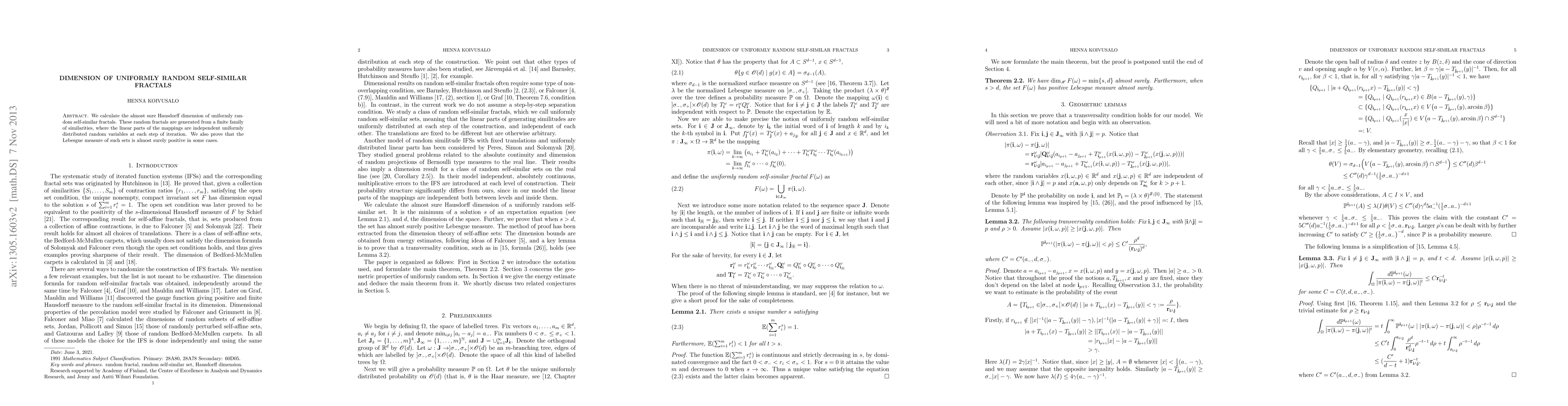 This paper calculates the almost sure Hausdorff dimension for uniformly random self-similar fractals generated by independent random transformations, and proves that their Lebesgue measure is almost surely positive under certain conditions.