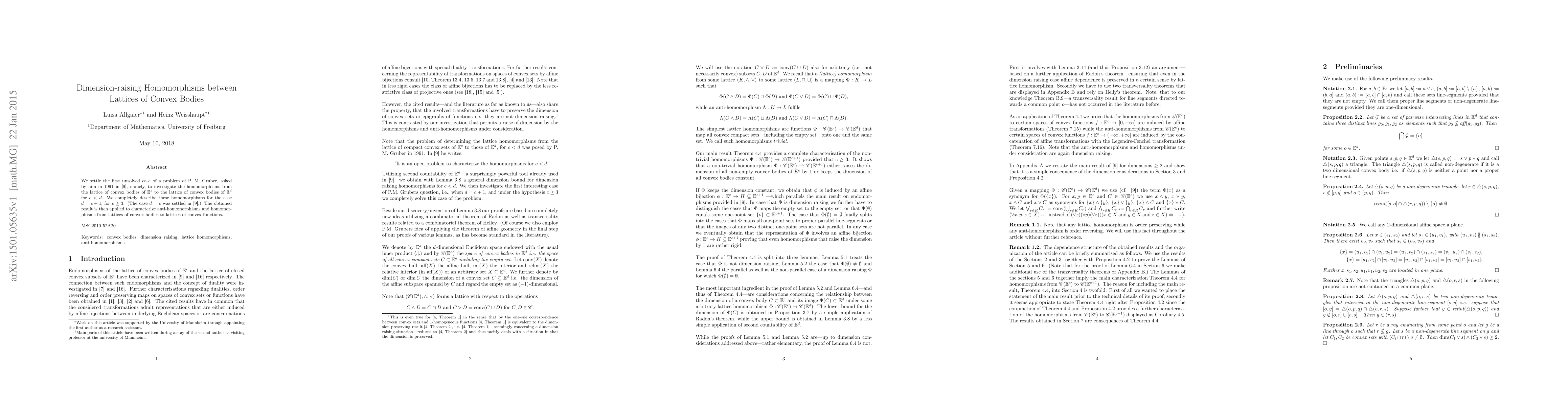 This paper resolves the last open case of Gruber's 1991 problem concerning dimension-raising homomorphisms between lattices of convex bodies, fully describing these homomorphisms when the dimension increases by one for three or more dimensions. The findings are also utilized to characterize anti-homomorphisms and homomorphisms in lattices of convex functions.