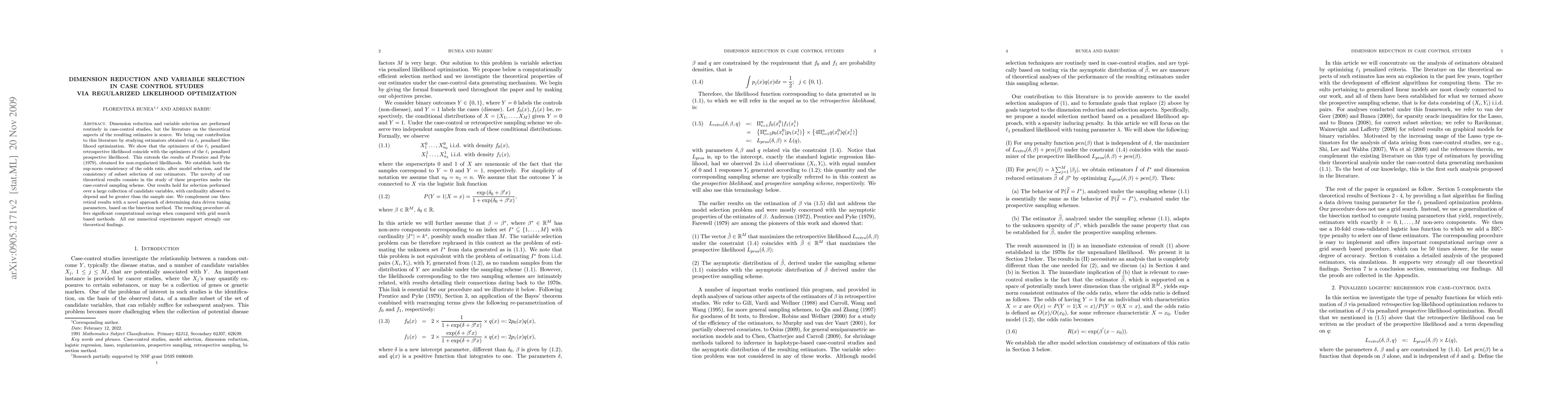 This paper investigates dimension reduction and variable selection in case-control studies using L1 penalized likelihood optimization, proving the consistency of odds ratios and subset selection under this scheme. It introduces a computationally efficient tuning parameter determination method, supported by numerical experiments validating theoretical results.