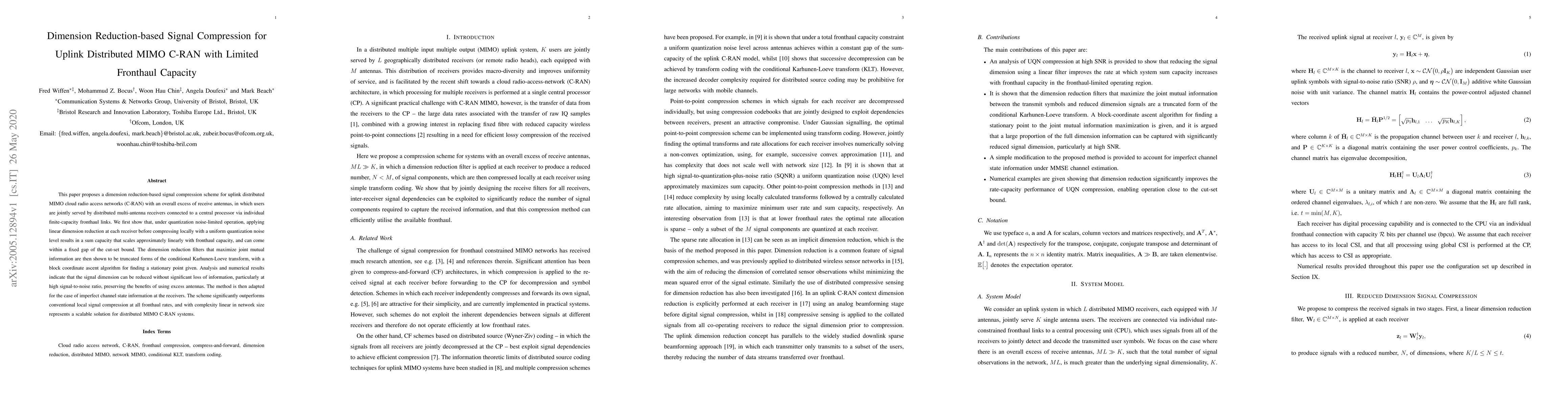 This paper proposes a dimension reduction-based signal compression scheme for uplink distributed MIMO C-RAN systems, demonstrating that it can achieve near-optimal sum capacity with linear scaling to fronthaul capacity, while significantly outperforming conventional local compression methods. The method is scalable and effective even with imperfect channel state information.
