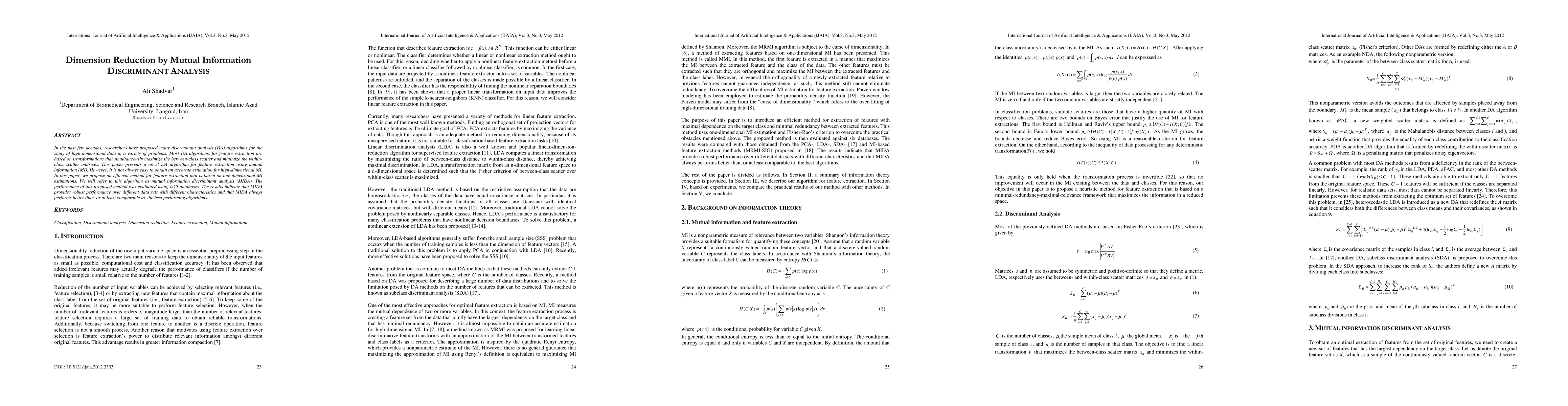 This paper proposes a novel discriminant analysis (DA) algorithm called Mutual Information Discriminant Analysis (MIDA) for feature extraction based on mutual information (MI). MIDA aims to create new features by transforming original features to maximize MI between transformed features and class labels while minimizing redundancy. The method is evaluated using six datasets from UCI databases.