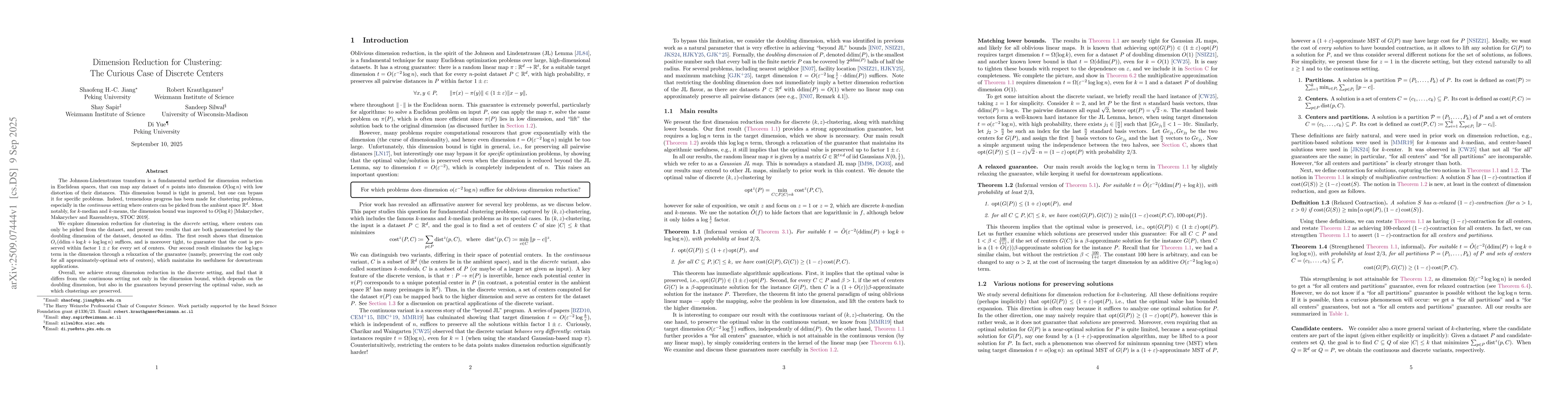 The Johnson-Lindenstrauss transform is a fundamental method for dimension reduction in Euclidean spaces, that can map any dataset of $n$ points into dimension $O(\log n)$ with low distortion of their distances. This dimension bound is tight in general, but one can bypass it for specific problems. Indeed, tremendous progress has been made for clustering problems, especially in the \emph{continuous} setting where centers can be picked from the ambient space $\mathbb{R}^d$. Most notably, for $k$-median and $k$-means, the dimension bound was improved to $O(\log k)$ [Makarychev, Makarychev and Razenshteyn, STOC 2019]. We explore dimension reduction for clustering in the \emph{discrete} setting, where centers can only be picked from the dataset, and present two results that are both parameterized by the doubling dimension of the dataset, denoted as $\operatorname{ddim}$. The first result shows that dimension $O_{\epsilon}(\operatorname{ddim} + \log k + \log\log n)$ suffices, and is moreover tight, to guarantee that the cost is preserved within factor $1\pm\epsilon$ for every set of centers. Our second result eliminates the $\log\log n$ term in the dimension through a relaxation of the guarantee (namely, preserving the cost only for all approximately-optimal sets of centers), which maintains its usefulness for downstream applications. Overall, we achieve strong dimension reduction in the discrete setting, and find that it differs from the continuous setting not only in the dimension bound, which depends on the doubling dimension, but also in the guarantees beyond preserving the optimal value, such as which clusterings are preserved.
