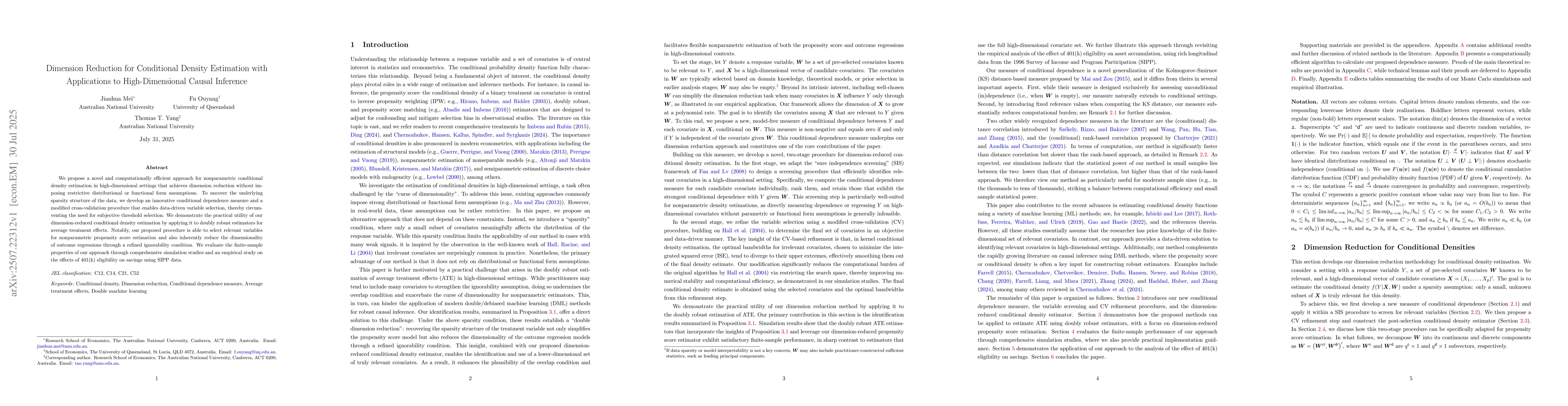 The paper introduces a computationally efficient approach for dimension reduction in nonparametric conditional density estimation, leveraging sparsity assumptions and a novel measure of conditional dependence.
