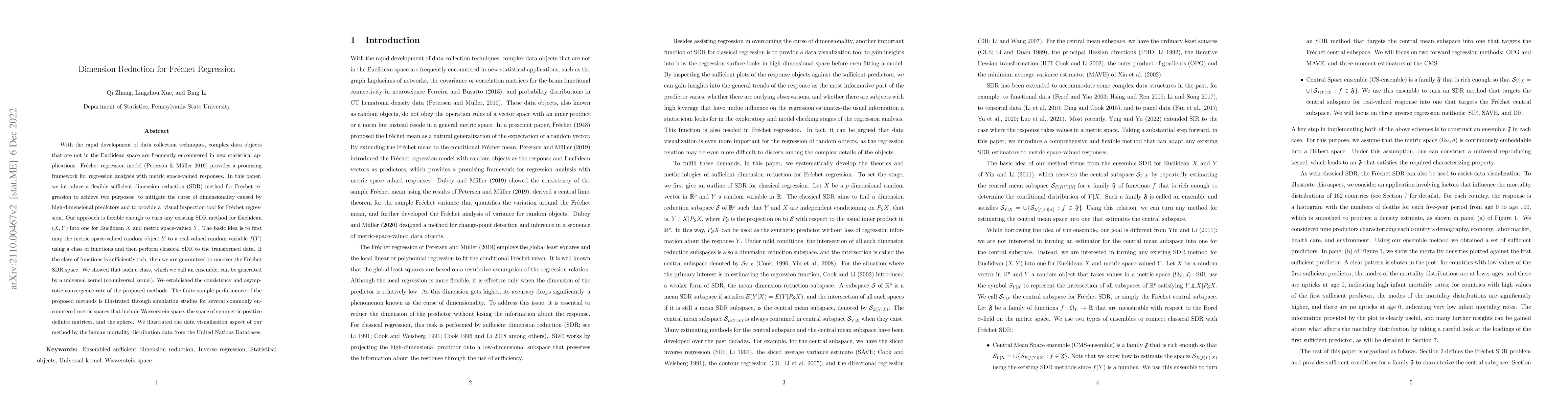 This paper introduces a sufficient dimension reduction method for Fr\'echet regression to handle high-dimensional predictors and provide visual inspection tools. It transforms metric space-valued responses into real-valued data, applies classical SDR, and establishes consistency and convergence rates. Simulation studies demonstrate performance on various metric spaces and data visualizations.