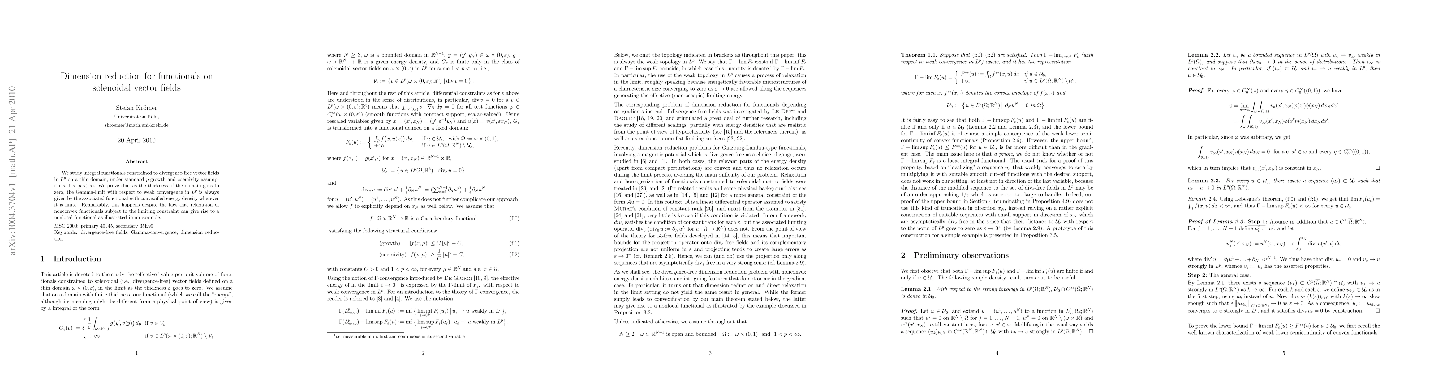 This paper investigates integral functionals on divergence-free vector fields in $L^p$ spaces, proving that as the domain thickness diminishes, the Gamma-limit converges to a convexified energy density functional, despite potential nonlocal relaxations in nonconvex cases.