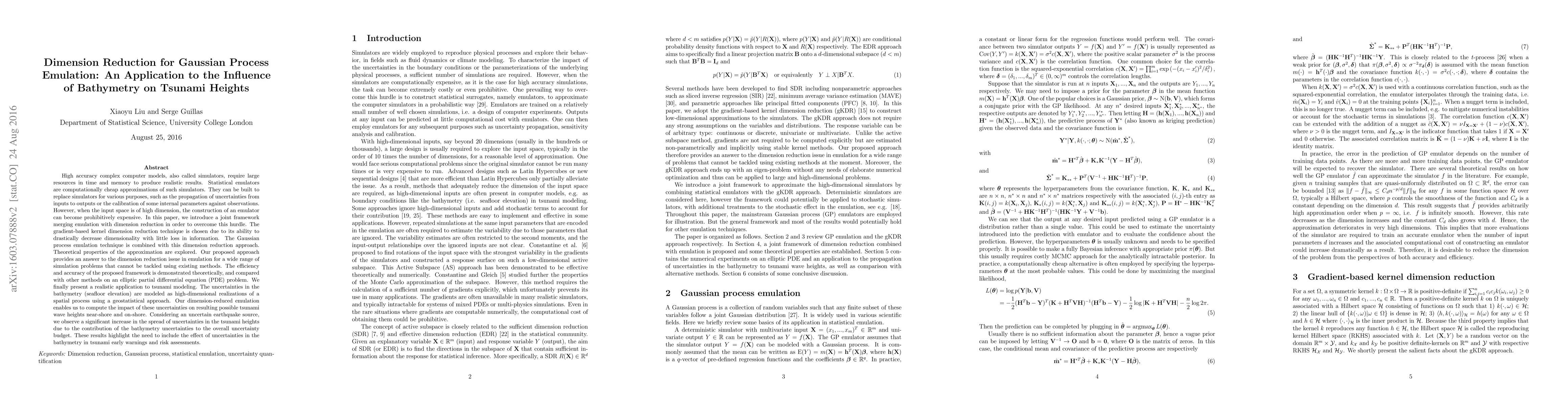 High accuracy complex computer models, or simulators, require large resources in time and memory to produce realistic results. Statistical emulators are computationally cheap approximations of such simulators. They can be built to replace simulators for various purposes, such as the propagation of uncertainties from inputs to outputs or the calibration of some internal parameters against observations. However, when the input space is of high dimension, the construction of an emulator can become prohibitively expensive. In this paper, we introduce a joint framework merging emulation with dimension reduction in order to overcome this hurdle. The gradient-based kernel dimension reduction technique is chosen due to its ability to drastically decrease dimensionality with little loss in information. The Gaussian process emulation technique is combined with this dimension reduction approach. Our proposed approach provides an answer to the dimension reduction issue in emulation for a wide range of simulation problems that cannot be tackled using existing methods. The efficiency and accuracy of the proposed framework is demonstrated theoretically, and compared with other methods on an elliptic partial differential equation (PDE) problem. We finally present a realistic application to tsunami modeling. The uncertainties in the bathymetry (seafloor elevation) are modeled as high-dimensional realizations of a spatial process using a geostatistical approach. Our dimension-reduced emulation enables us to compute the impact of these uncertainties on resulting possible tsunami wave heights near-shore and on-shore. We observe a significant increase in the spread of uncertainties in the tsunami heights due to the contribution of the bathymetry uncertainties. These results highlight the need to include the effect of uncertainties in the bathymetry in tsunami early warnings and risk assessments.