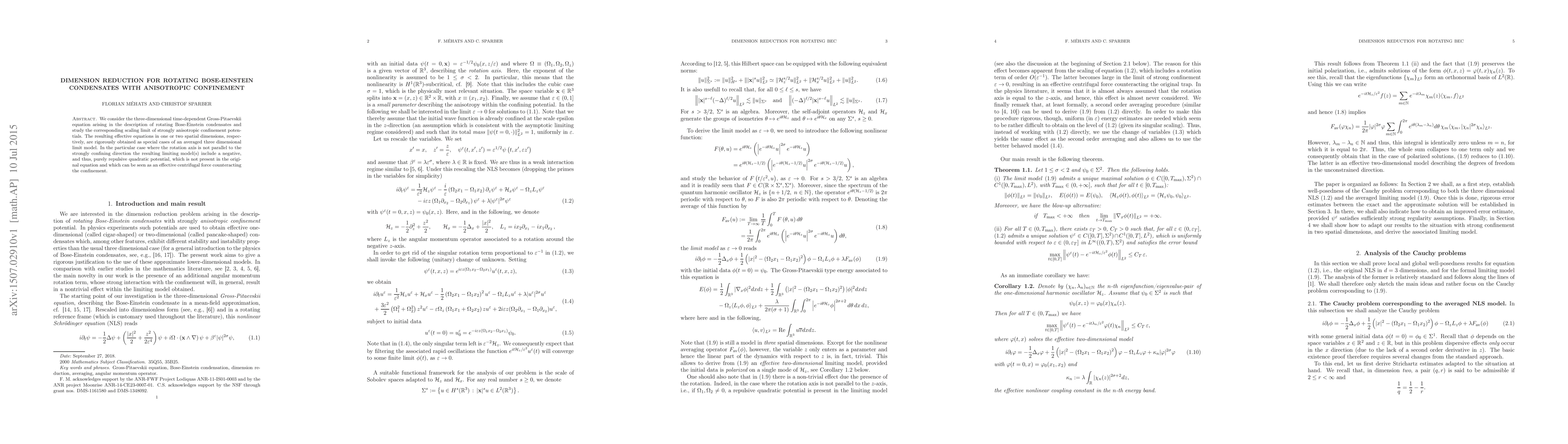 This paper rigorously derives effective one or two-dimensional equations from the three-dimensional Gross-Pitaevskii equation for rotating Bose-Einstein condensates under strongly anisotropic confinement. The resulting models include an effective repulsive centrifugal force in cases where the rotation axis is not aligned with the confinement direction.