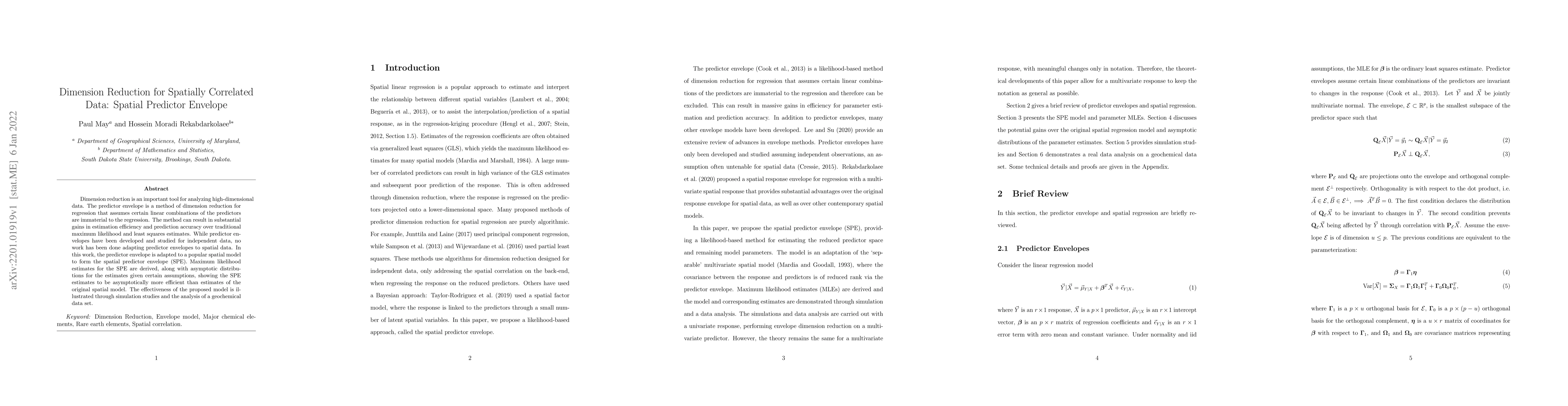 This paper proposes a spatial predictor envelope (SPE) method for dimension reduction in spatially correlated data, adapting the predictor envelope technique to a spatial model. The SPE method is shown to be more efficient than traditional methods, as demonstrated through simulations and a geo-chemical dataset analysis.