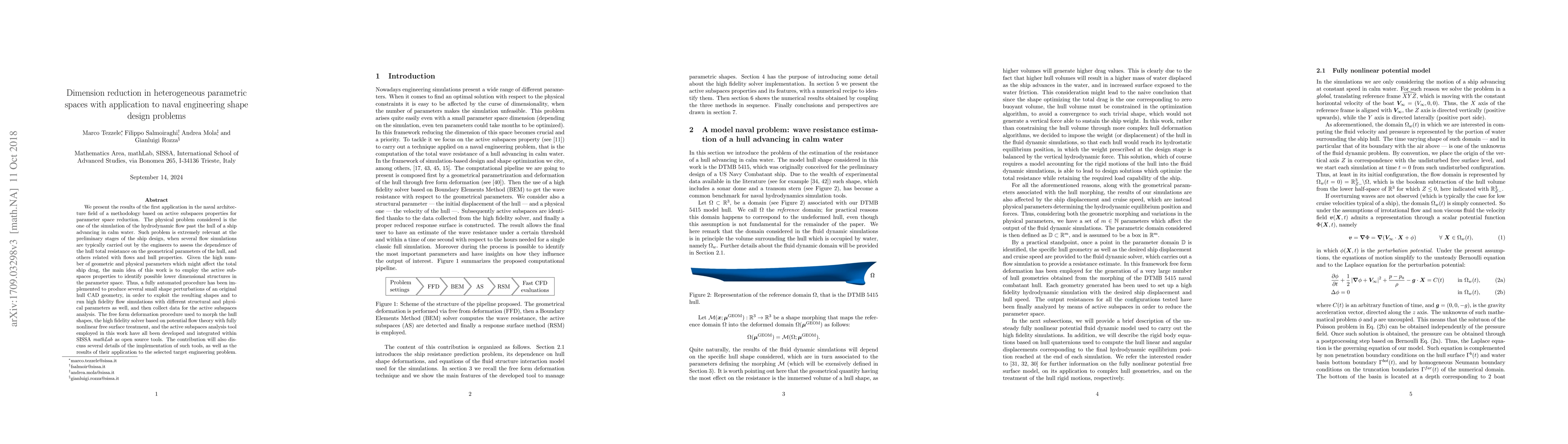 We present the results of the first application in the naval architecture field of a methodology based on active subspaces properties for parameters space reduction. The physical problem considered is the one of the simulation of the hydrodynamic flow past the hull of a ship advancing in calm water. Such problem is extremely relevant at the preliminary stages of the ship design, when several flow simulations are typically carried out by the engineers to assess the dependence of the hull total resistance on the geometrical parameters of the hull, and others related with flows and hull properties. Given the high number of geometric and physical parameters which might affect the total ship drag, the main idea of this work is to employ the active subspaces properties to identify possible lower dimensional structures in the parameter space. Thus, a fully automated procedure has been implemented to produce several small shape perturbations of an original hull CAD geometry, in order to exploit the resulting shapes to run high fidelity flow simulations with different structural and physical parameters as well, and then collect data for the active subspaces analysis. The free form deformation procedure used to morph the hull shapes, the high fidelity solver based on potential flow theory with fully nonlinear free surface treatment, and the active subspaces analysis tool employed in this work have all been developed and integrated within SISSA math- Lab as open source tools. The contribution will also discuss several details of the implementation of such tools, as well as the results of their application to the selected target engineering problem.