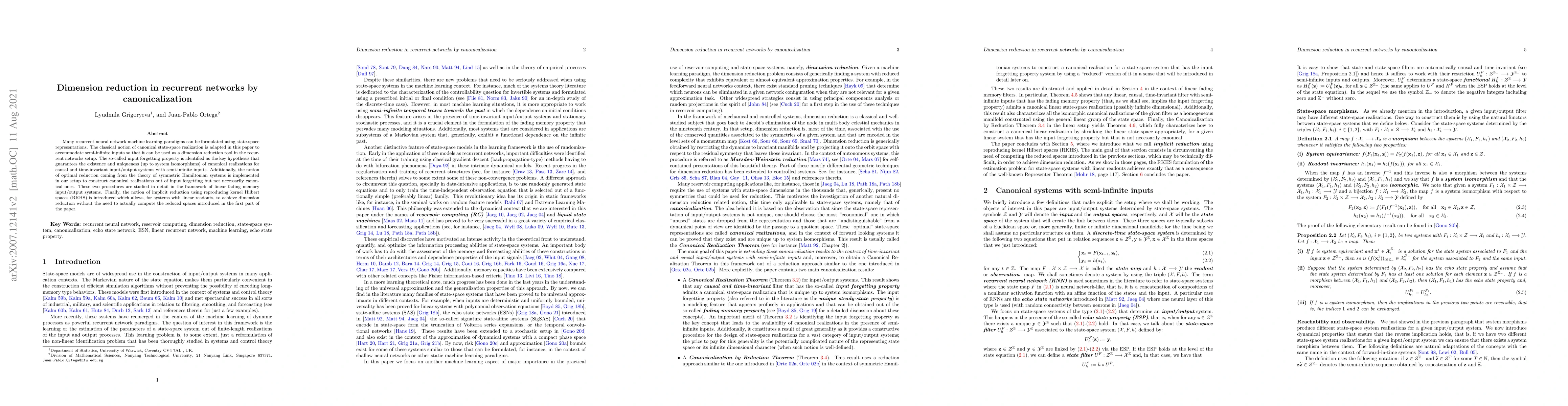 Many recurrent neural network machine learning paradigms can be formulated using state-space representations. The classical notion of canonical state-space realization is adapted in this paper to accommodate semi-infinite inputs so that it can be used as a dimension reduction tool in the recurrent networks setup. The so-called input forgetting property is identified as the key hypothesis that guarantees the existence and uniqueness (up to system isomorphisms) of canonical realizations for causal and time-invariant input/output systems with semi-infinite inputs. Additionally, the notion of optimal reduction coming from the theory of symmetric Hamiltonian systems is implemented in our setup to construct canonical realizations out of input forgetting but not necessarily canonical ones. These two procedures are studied in detail in the framework of linear fading memory input/output systems. Finally, the notion of implicit reduction using reproducing kernel Hilbert spaces (RKHS) is introduced which allows, for systems with linear readouts, to achieve dimension reduction without the need to actually compute the reduced spaces introduced in the first part of the paper.