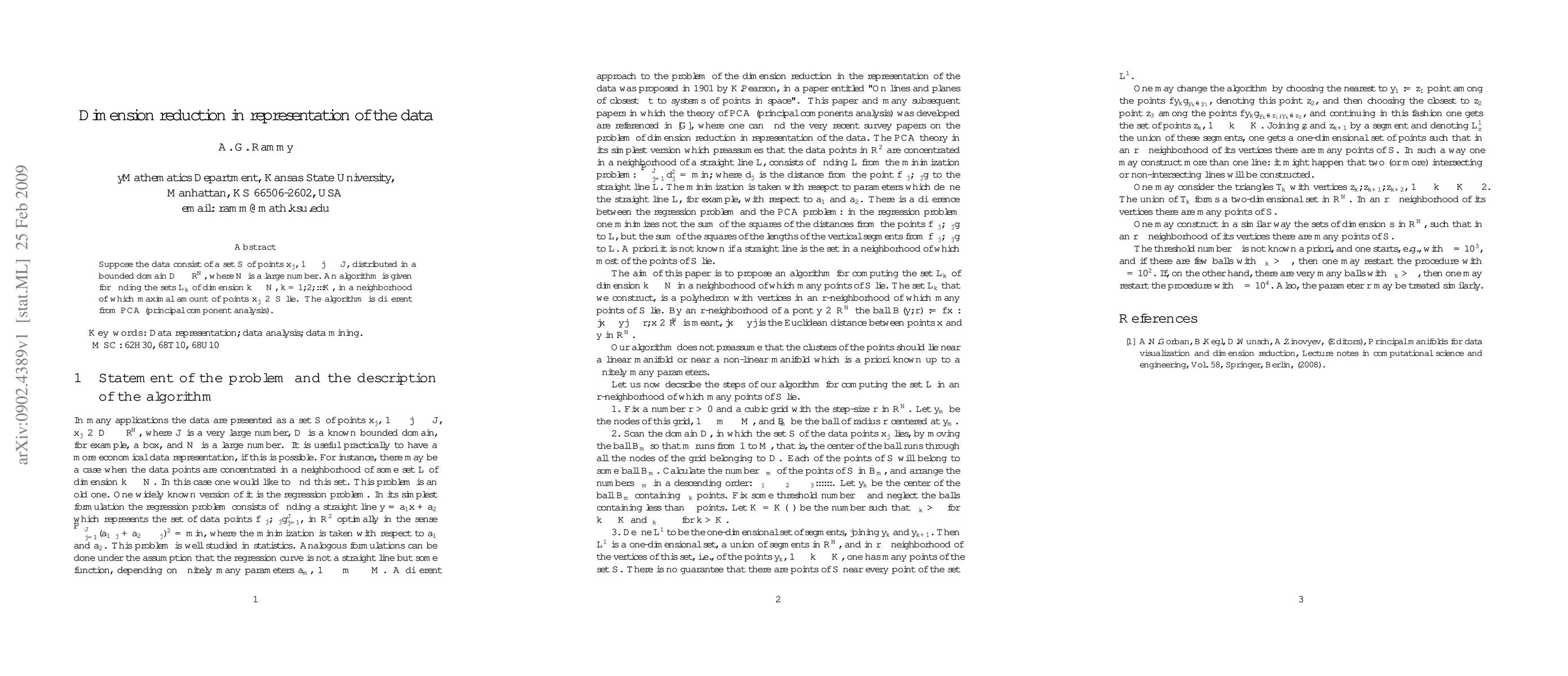 Suppose the data consist of a set $S$ of points $x_j$, $1\leq j \leq J$, distributed in a bounded domain $D\subset R^N$, where $N$ is a large number. An algorithm is given for finding the sets $L_k$ of dimension $k\ll N$, $k=1,2,...K$, in a neighborhood of which maximal amount of points $x_j\in S$ lie. The algorithm is different from PCA (principal component analysis)