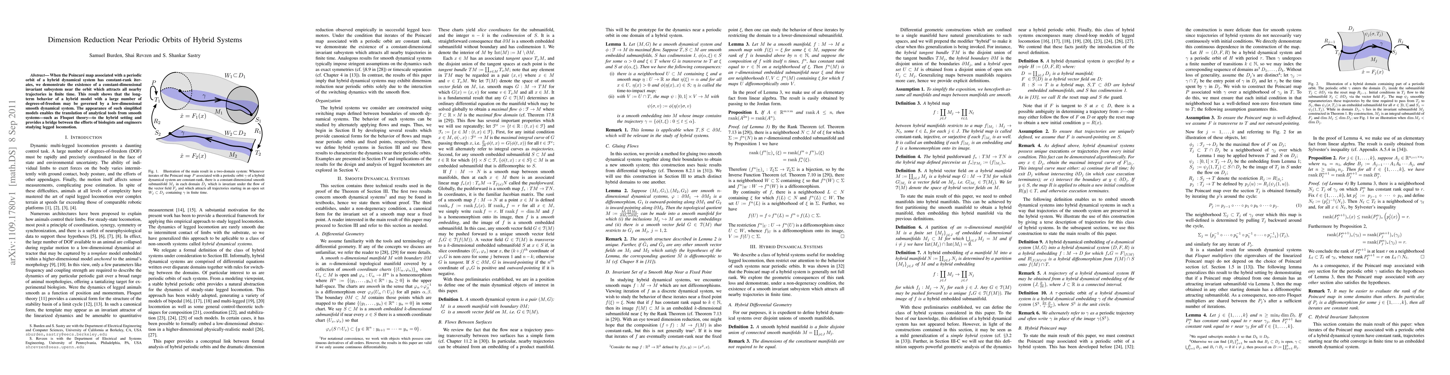 When the Poincar\'{e} map associated with a periodic orbit of a hybrid dynamical system has constant-rank iterates, we demonstrate the existence of a constant-dimensional invariant subsystem near the orbit which attracts all nearby trajectories in finite time. This result shows that the long-term behavior of a hybrid model with a large number of degrees-of-freedom may be governed by a low-dimensional smooth dynamical system. The appearance of such simplified models enables the translation of analytical tools from smooth systems-such as Floquet theory-to the hybrid setting and provides a bridge between the efforts of biologists and engineers studying legged locomotion.
