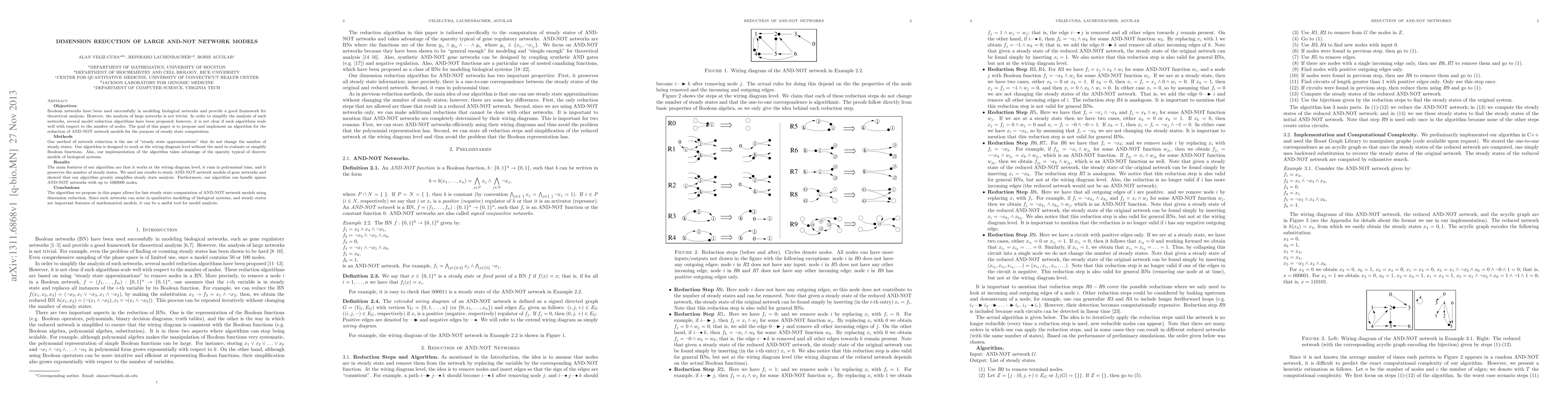 Boolean networks have been used successfully in modeling biological networks and provide a good framework for theoretical analysis. However, the analysis of large networks is not trivial. In order to simplify the analysis of such networks, several model reduction algorithms have been proposed; however, it is not clear if such algorithms scale well with respect to the number of nodes. The goal of this paper is to propose and implement an algorithm for the reduction of AND-NOT network models for the purpose of steady state computation. Our method of network reduction is the use of "steady state approximations" that do not change the number of steady states. Our algorithm is designed to work at the wiring diagram level without the need to evaluate or simplify Boolean functions. Also, our implementation of the algorithm takes advantage of the sparsity typical of discrete models of biological systems. The main features of our algorithm are that it works at the wiring diagram level, it runs in polynomial time, and it preserves the number of steady states. We used our results to study AND-NOT network models of gene networks and showed that our algorithm greatly simplifies steady state analysis. Furthermore, our algorithm can handle sparse AND-NOT networks with up to 1000000 nodes.