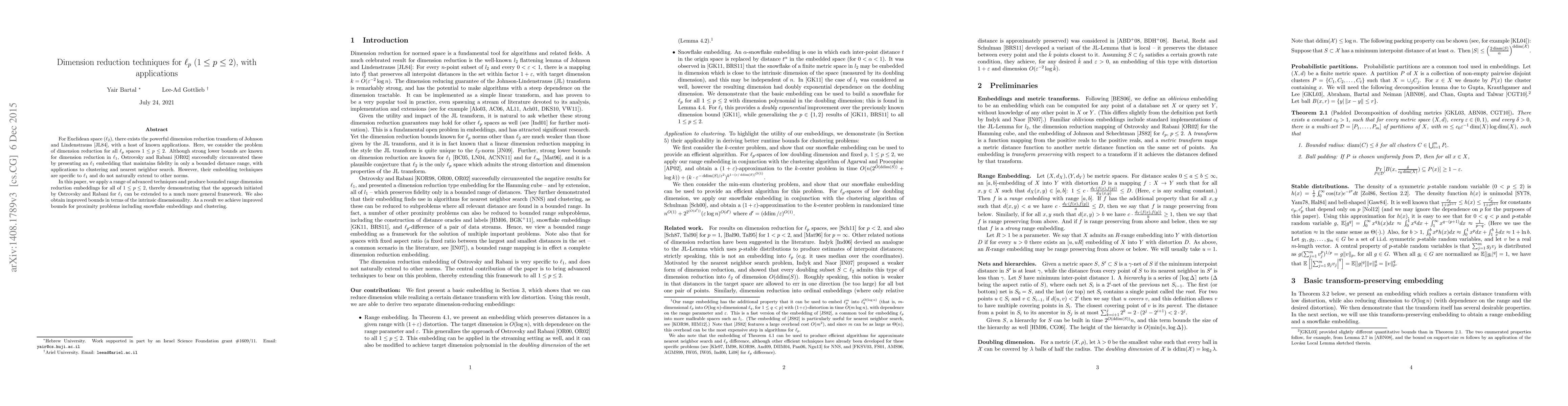 This paper develops dimension reduction techniques for $\ell_p$ spaces where $1 \le p \le 2$, extending the approach of Ostrovsky and Rabani for $\ell_1$ to a broader framework. It achieves improved bounds for proximity problems and clustering applications.