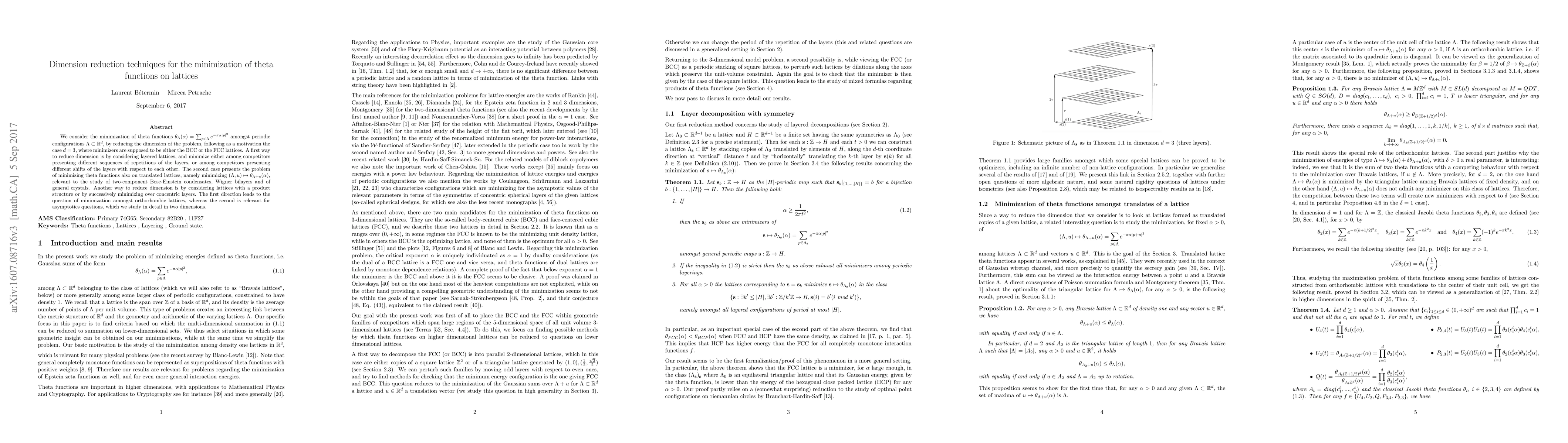 We consider the minimization of theta functions $\theta\_\Lambda(\alpha)=\sum\_{p\in\Lambda}e^{-\pi\alpha|p|^2}$ amongst lattices $\Lambda\subset \mathbb R^d$, by reducing the dimension of the problem, following as a motivation the case $d=3$, where minimizers are supposed to be either the BCC or the FCC lattices. A first way to reduce dimension is by considering layered lattices, and minimize either among competitors presenting different sequences of repetitions of the layers, or among competitors presenting different shifts of the layers with respect to each other. The second case presents the problem of minimizing theta functions also on translated lattices, namely minimizing $(L,u)\mapsto \theta\_{L+u}(\alpha)$. Another way to reduce dimension is by considering lattices with a product structure or by successively minimizing over concentric layers. The first direction leads to the question of minimization amongst orthorhombic lattices, whereas the second is relevant for asymptotics questions, which we study in detail in two dimensions.