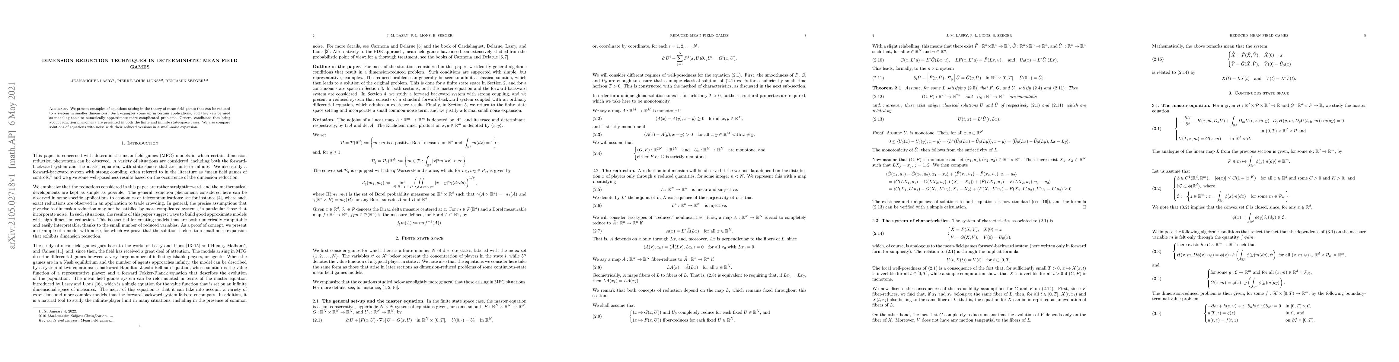 This paper explores dimension reduction techniques for deterministic mean field games, presenting conditions under which these equations can be simplified to smaller dimensions. It also compares solutions of noisy equations with their reduced counterparts in a small-noise expansion.