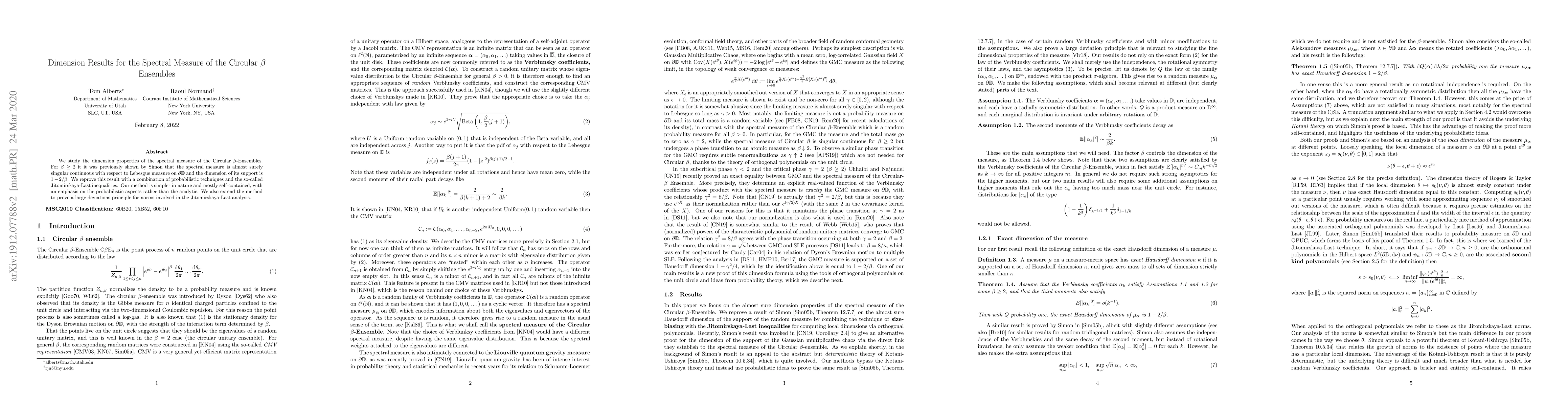 This paper reexamines the dimension properties of the spectral measure for Circular $\beta$-Ensembles, confirming Simon's results on almost sure singularity and dimension $1 - 2/\beta$ for $\beta \geq 2$ using probabilistic techniques. It also establishes a large deviations principle for norms in the Jitomirskaya-Last analysis.