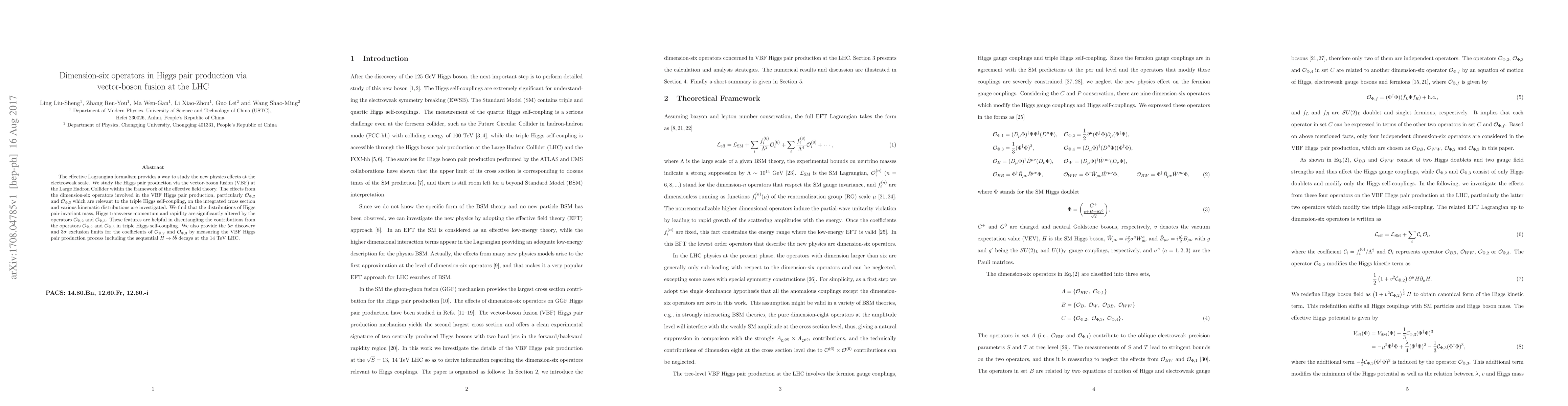 The effective Lagrangian formalism provides a way to study the new physics effects at the electroweak scale. We study the Higgs pair production via the vector-boson fusion (VBF) at the Large Hadron Collider within the framework of the effective field theory. The effects from the dimension-six operators involved in the VBF Higgs pair production, particularly $\mathcal{O}_{\Phi,2}$ and $\mathcal{O}_{\Phi,3}$ which are relevant to the triple Higgs self-coupling, on the integrated cross section and various kinematic distributions are investigated. We find that the distributions of Higgs pair invariant mass, Higgs transverse momentum and rapidity are significantly altered by the operators $\mathcal{O}_{\Phi,2}$ and $\mathcal{O}_{\Phi,3}$. These features are helpful in disentangling the contributions from the operators $\mathcal{O}_{\Phi,2}$ and $\mathcal{O}_{\Phi,3}$ in triple Higgs self-coupling. We also provide the 5$\sigma$ discovery and 3$\sigma$ exclusion limits for the coefficients of $\mathcal{O}_{\Phi,2}$ and $\mathcal{O}_{\Phi,3}$ by measuring the VBF Higgs pair production process including the sequential $H \rightarrow b\bar{b}$ decays at the $14~ {\rm TeV}$ LHC.