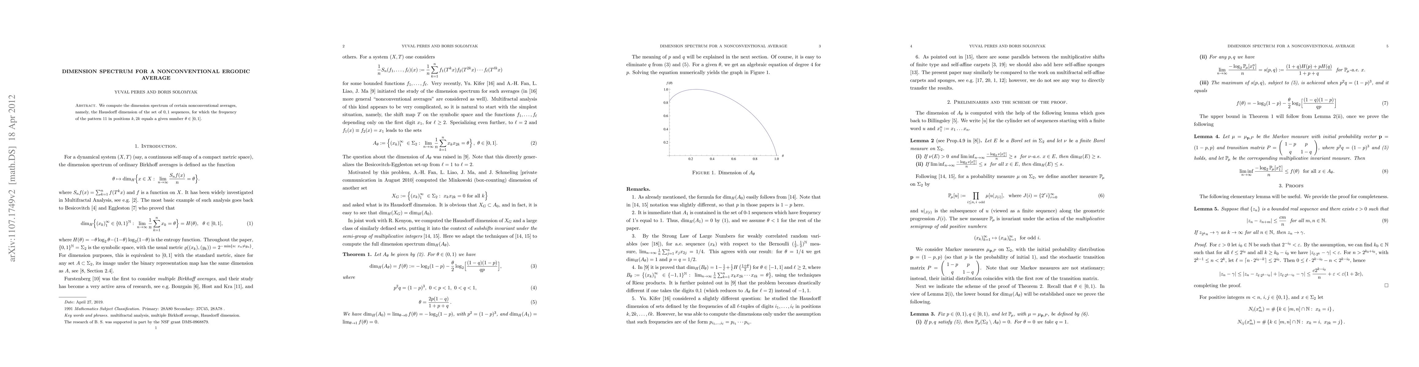 Summary: This paper computes the dimension spectrum for nonconventional ergodic averages, specifically focusing on the Hausdorff dimension of $0,1$ sequences where the frequency of the pattern "11" at positions $k$ and $2k$ matches a given number $\theta$. The study provides insights into the geometric properties of these sequences.