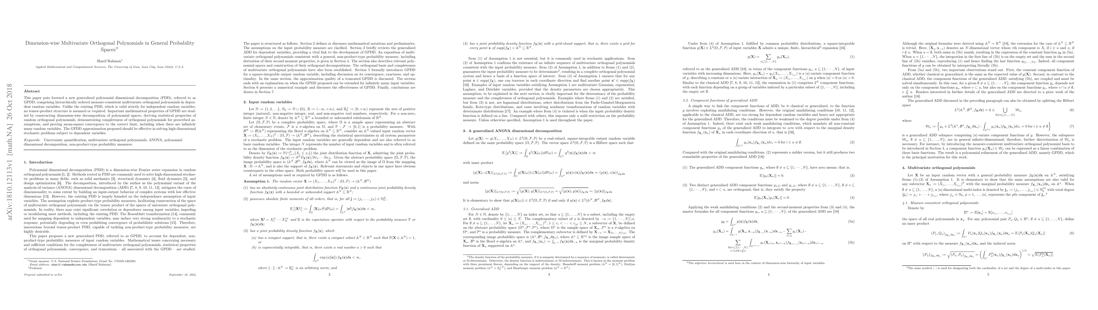 This paper introduces GPDD, a novel generalized polynomial dimensional decomposition for multivariate orthogonal polynomials in dependent random variables, without assuming a tensor-product structure. It studies its mathematical properties, demonstrating completeness and mean-square convergence, and proposes it as an effective method for high-dimensional stochastic problems.