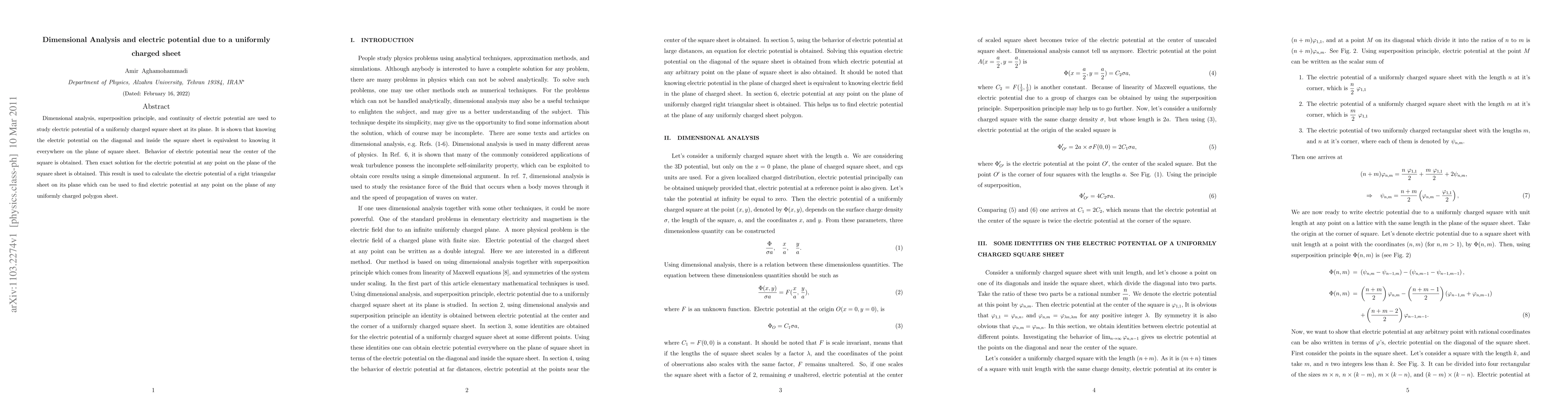 A research paper uses dimensional analysis and electric potential principles to find that knowing electric potential on a square sheet's diagonal and inside is equivalent to knowing it everywhere on the plane. The study leads to an exact solution for electric potential at any point on the square sheet, with implications for calculating electric potential of other uniformly charged polygon sheets.