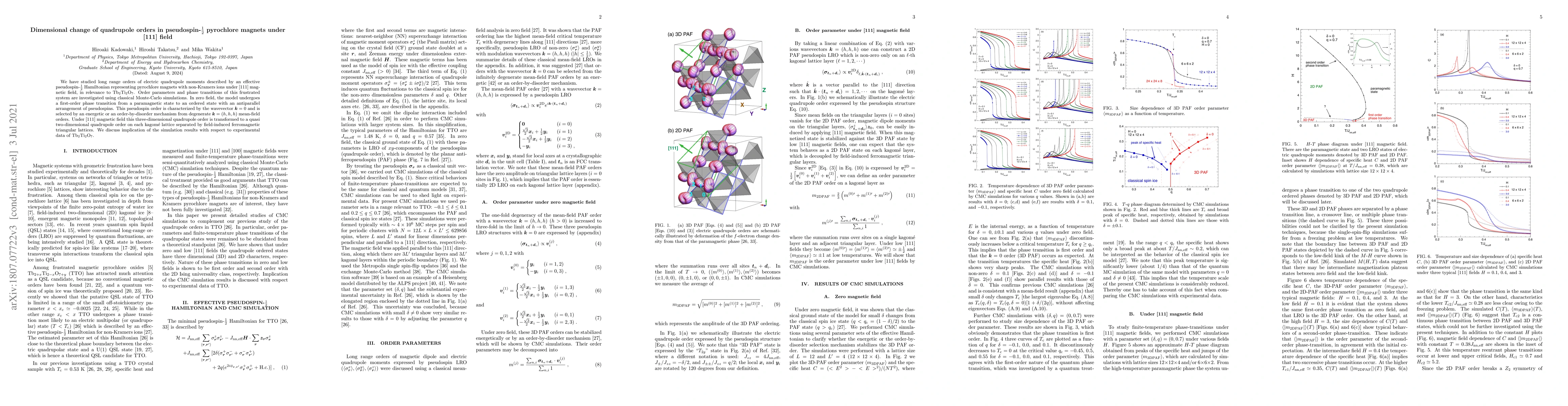 We have studied long range orders of electric quadrupole moments described by an effective pseudospin-$\frac{1}{2}$ Hamiltonian representing pyrochlore magnets with non-Kramers ions under [111] magnetic field, in relevance to Tb$_{2}$Ti$_{2}$O$_{7}$. Order parameters and phase transitions of this frustrated system are investigated using classical Monte-Carlo simulations. In zero field, the model undergoes a first-order phase transition from a paramagnetic state to an ordered state with an antiparallel arrangement of pseudospins. This pseudospin order is characterized by the wavevector $\boldsymbol{k}=0$ and is selected by an energetic or an order-by-disorder mechanism from degenerate $\boldsymbol{k}=(h,h,h)$ mean-field orders. Under [111] magnetic field this three-dimensional quadrupole order is transformed to a quasi two-dimensional quadrupole order on each kagom\'{e} lattice separated by field-induced ferromagnetic triangular lattices. We discuss implication of the simulation results with respect to experimental data of Tb$_{2}$Ti$_{2}$O$_{7}$.